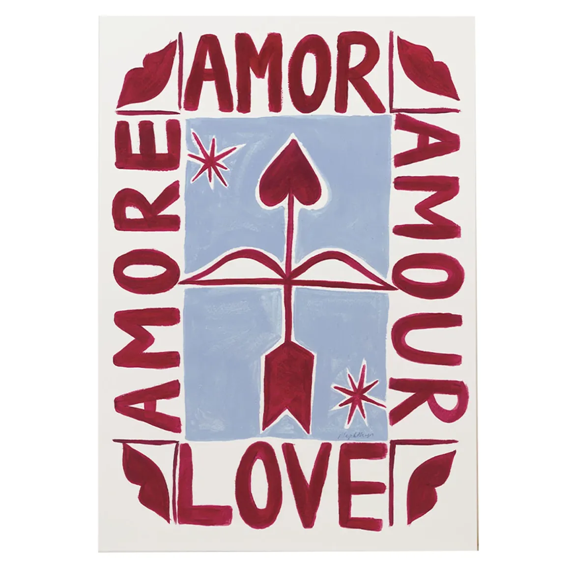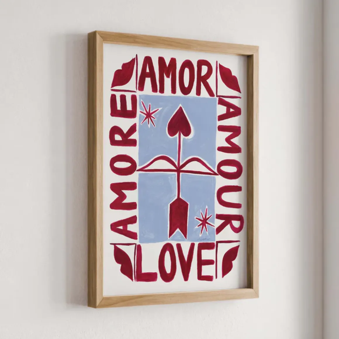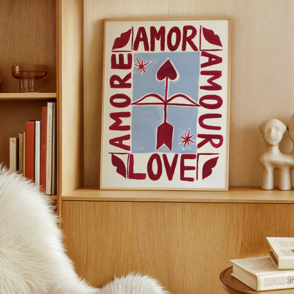 Découvrez l’affiche Languages of Love signée Nephthys Illustrated, une affiche acrylique vibrante et artisanale, tirée de la collection Saint-Valentin 2025. Le mot « amour » s’écrit dans quatre langues différentes, en bordeaux intense, autour d’un motif minimaliste en forme de flèche, rehaussé de touches de bleu bleuet, illustrant le caractère universel de l’amour.