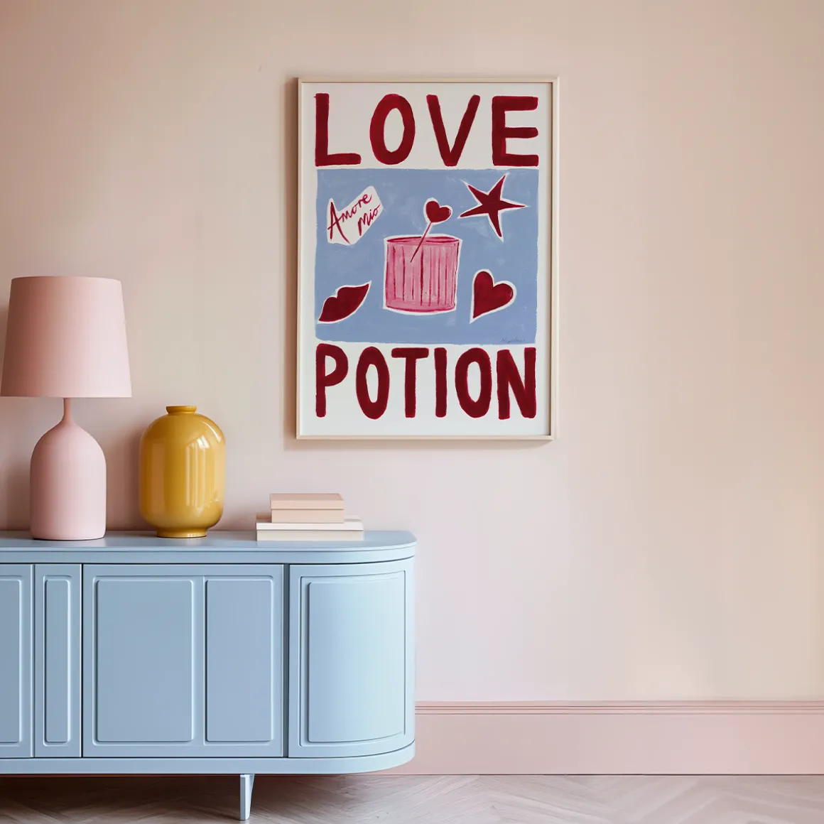 Découvrez l’affiche Love Potion signée Nephthys Illustrated, une création ludique réalisée à la main à l’acrylique, avec des lettres rouges éclatantes et des motifs romantiques sur un fond bleu doux et apaisant. Ce design spécial Saint-Valentin 2025 associe une esthétique rétro à une touche contemporaine. Idéale pour sublimer vos murs tout au long de l’année, l’affiche Love Potion diffuse une ambiance d’amour et s’intègre parfaitement à une déco moderne ou vintage.