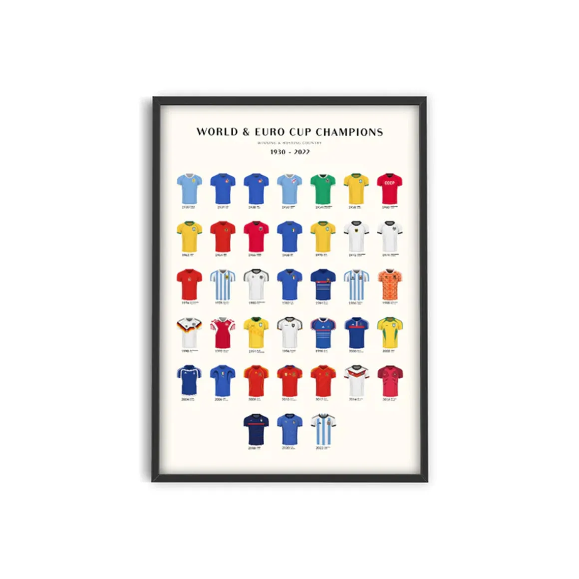 Une affiche pour les amateurs de football ! À la fois colorée et éducative, l’affiche illustre les gagnants de la coupe du monde de 1930 à aujourd’hui et apporte une touche culturel et vintage à votre intérieur.
