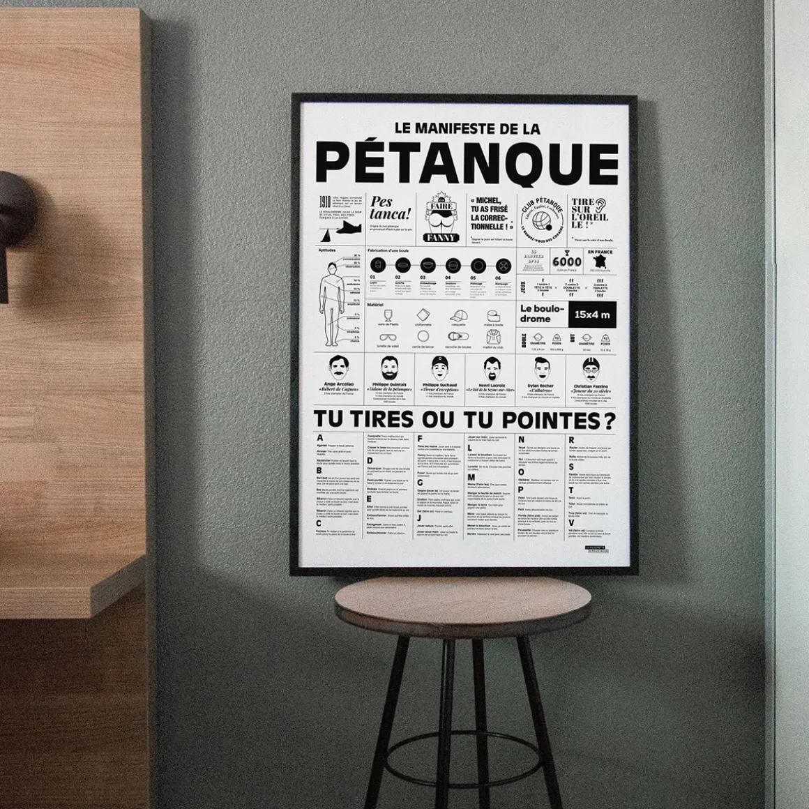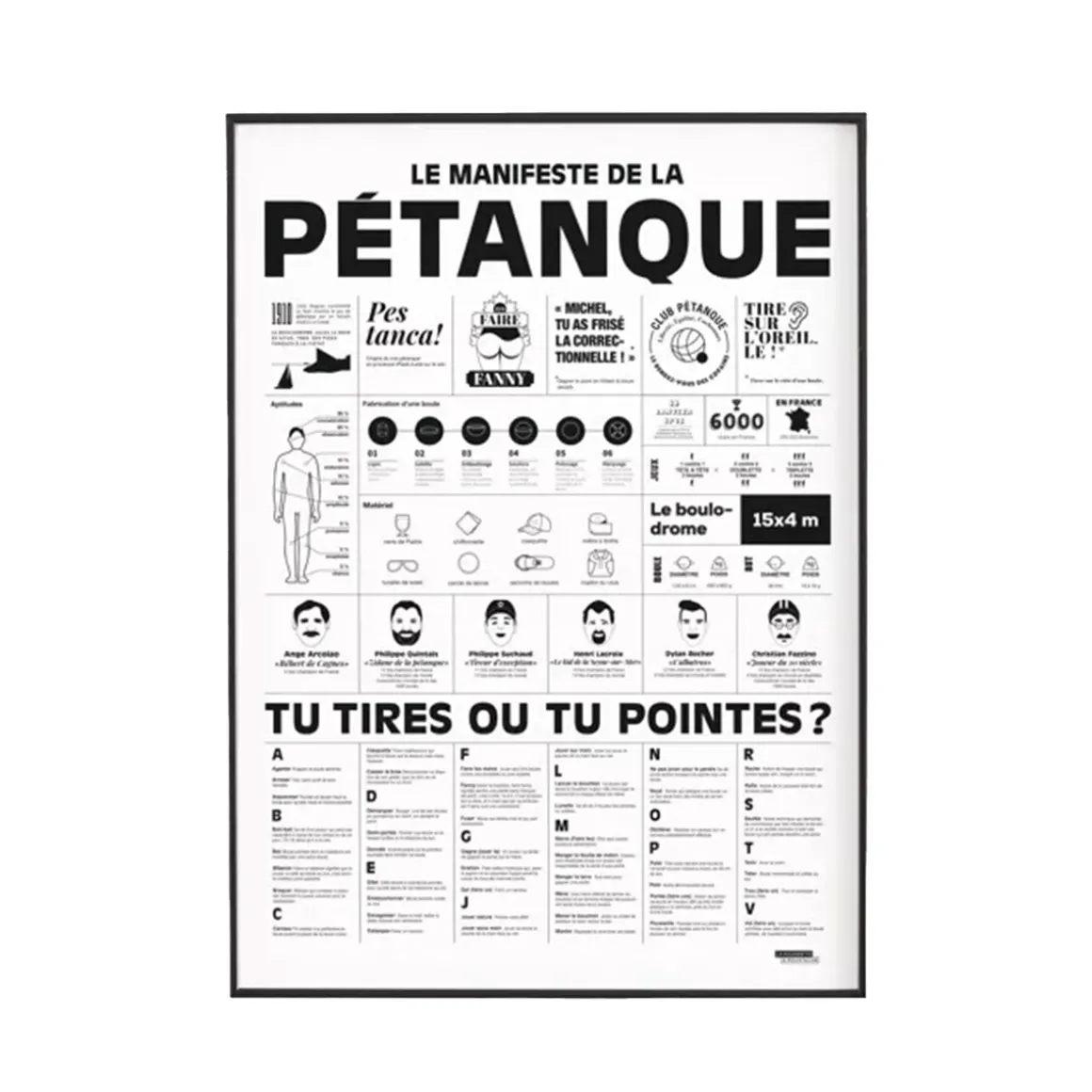 Avis à tous les amoureux de la pétanque ! Découvrez notre affiche Le manifeste de la pétanque qui parcoure les must-haves et connaissances à avoir pour jouer aux boules. Imprimée en noir et blanc, cette affiche se fond dans n’importe quel décor.