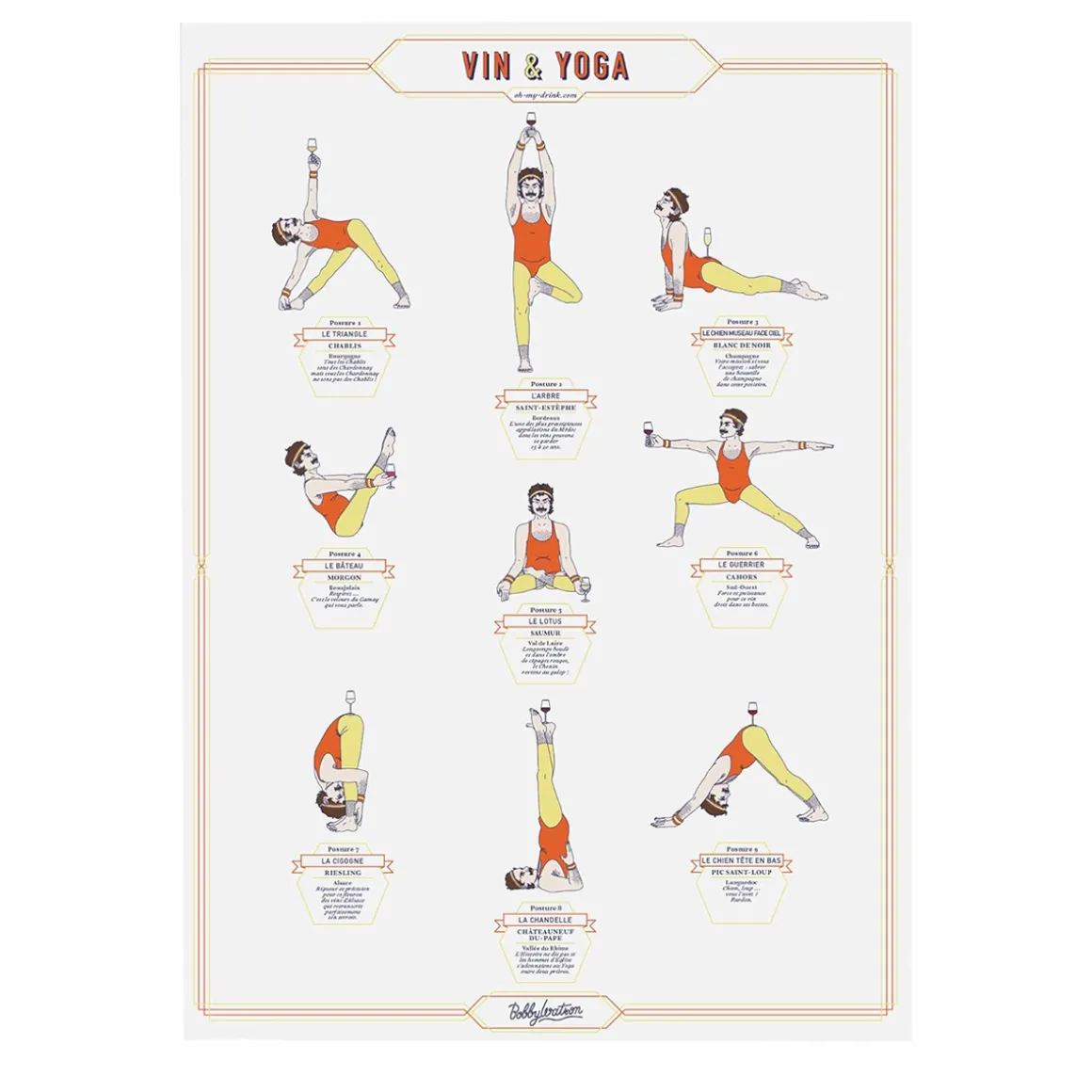 Une affiche amusante pour les amateurs de vin et de yoga ! Affichez votre amour pour ces deux passions avec cette affiche unique. Parfait pour décorer votre salle de méditation ou votre cave à vin. Parlez de vin et de yoga !