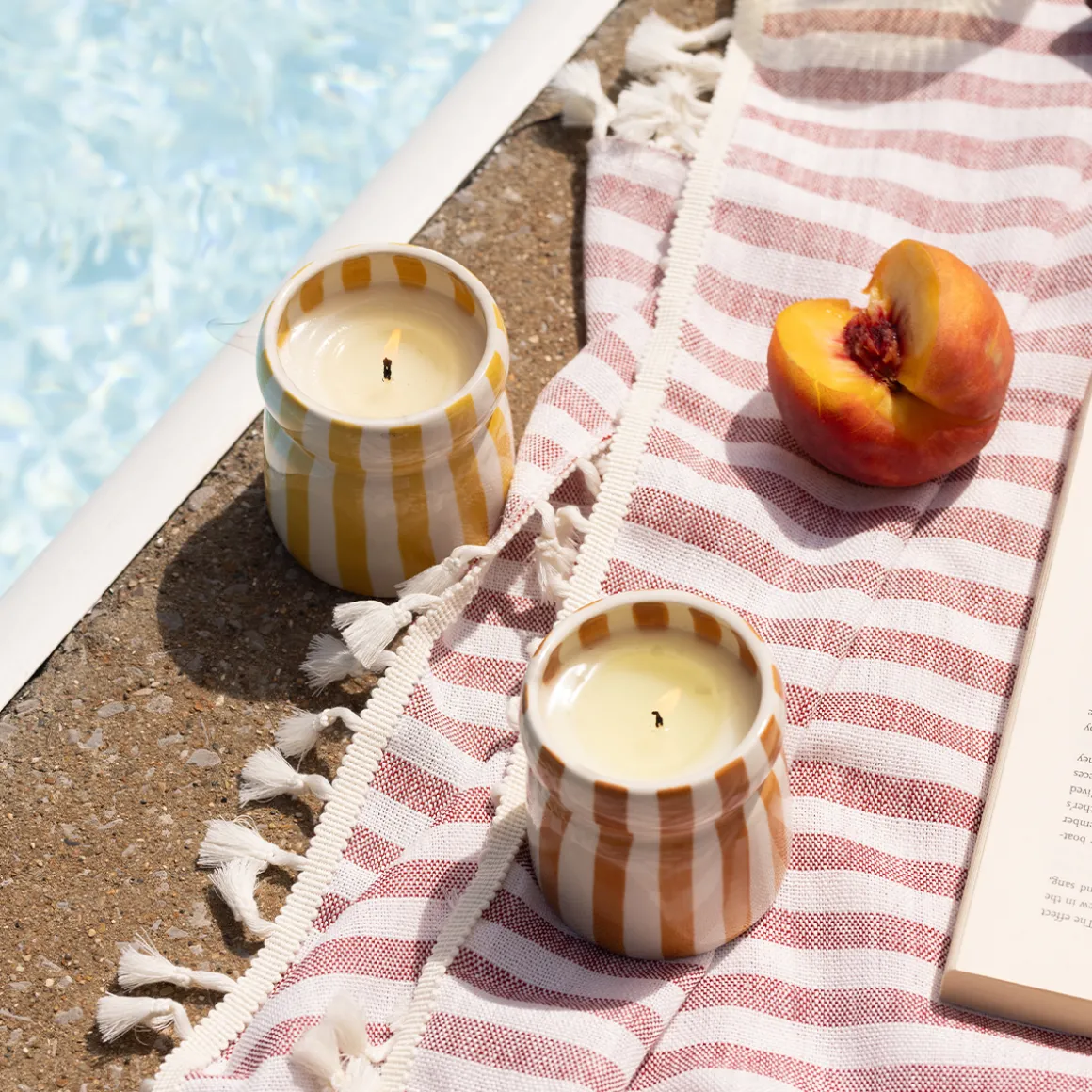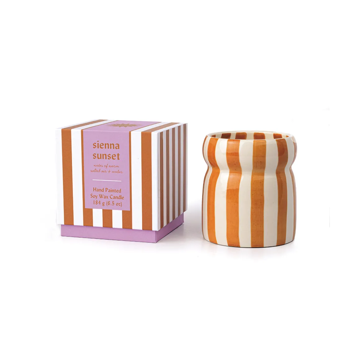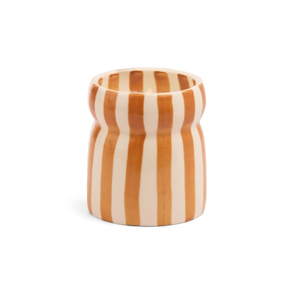 Découvrez la Bougie Cabana Sienna Sunset avec ses rayures élégantes. Elle apporte une ambiance chaleureuse et chic à toute pièce. Allumez-la pour une soirée relaxante ou en cadeau pour un ami. Niveau d’éclat à souhait (oui, on l’a dit).