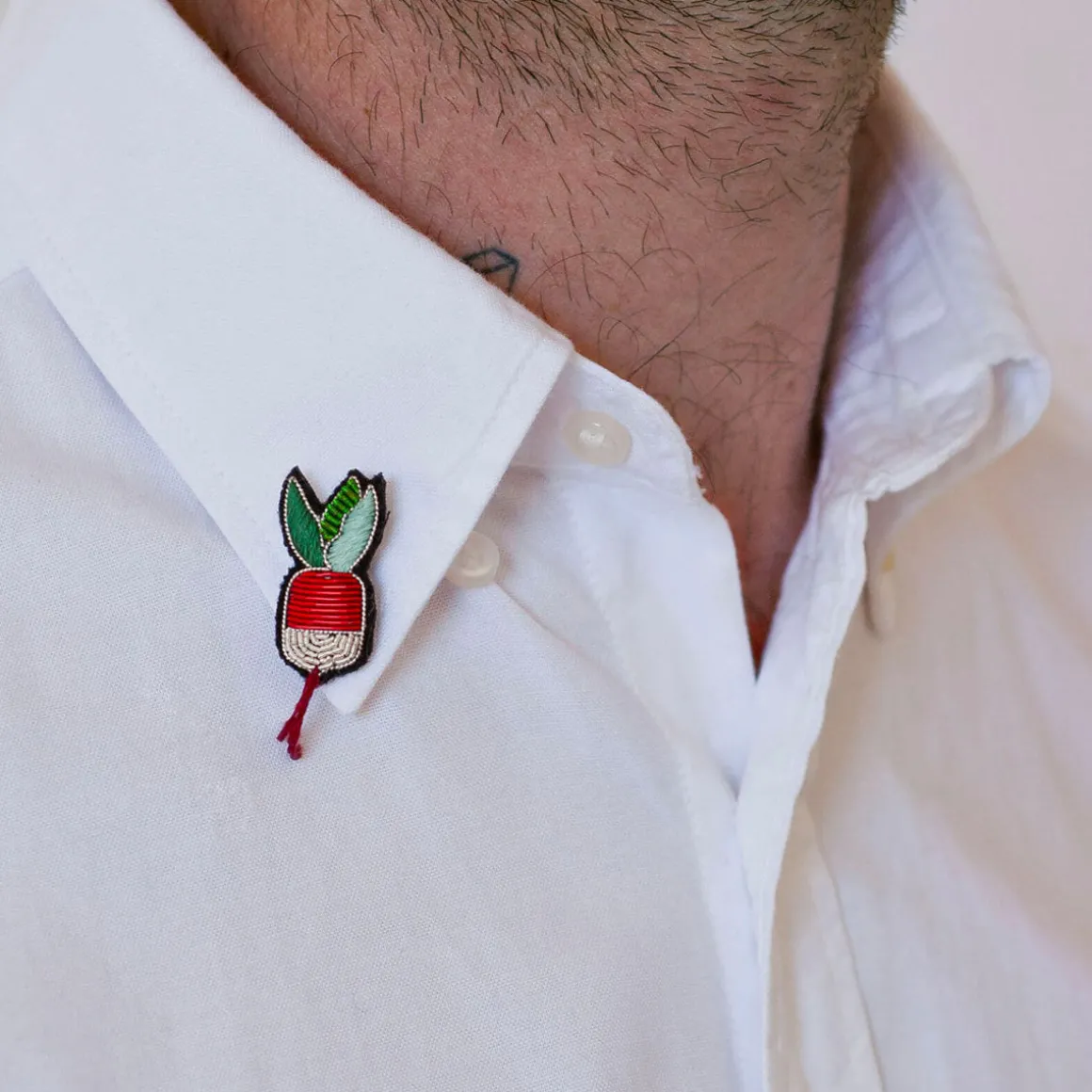 Découvrez la Broche Petit Radis, un accessoire irrésistiblement décalé, dessiné et brodé à la main avec soin. Porteuse d’un message plein de fraîcheur et d’humour, cette broche ajoute une touche décalée à vos tenues.