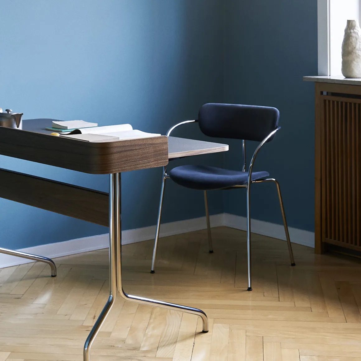 Lorsque l’agence de design Anderssen u0026amp; Voll a créé sa série de chaises Pavilion, le duo primé s’est inspiré de l’emblématique Langelinie Pavilion. Aujourd’hui, cette esthétique légère et lyrique a été traduite en un bureau compact destiné à convenir à la fois aux espaces de bureau et à la maison. Conçu au début de la pandémie, le bureau Pavilion AV17 a pris en compte les exigences du travail à domicile avec une version dotée d’un panneau arrière. Son esthétique épurée et minimaliste développée pour la maison danoise And Tradition met en avant la pureté de la forme, d’une finesse et élégance exemplaires. Un espace affirmé, aux lignes savamment dessinées, disponible en plusieurs finitions, chêne ou noyer.