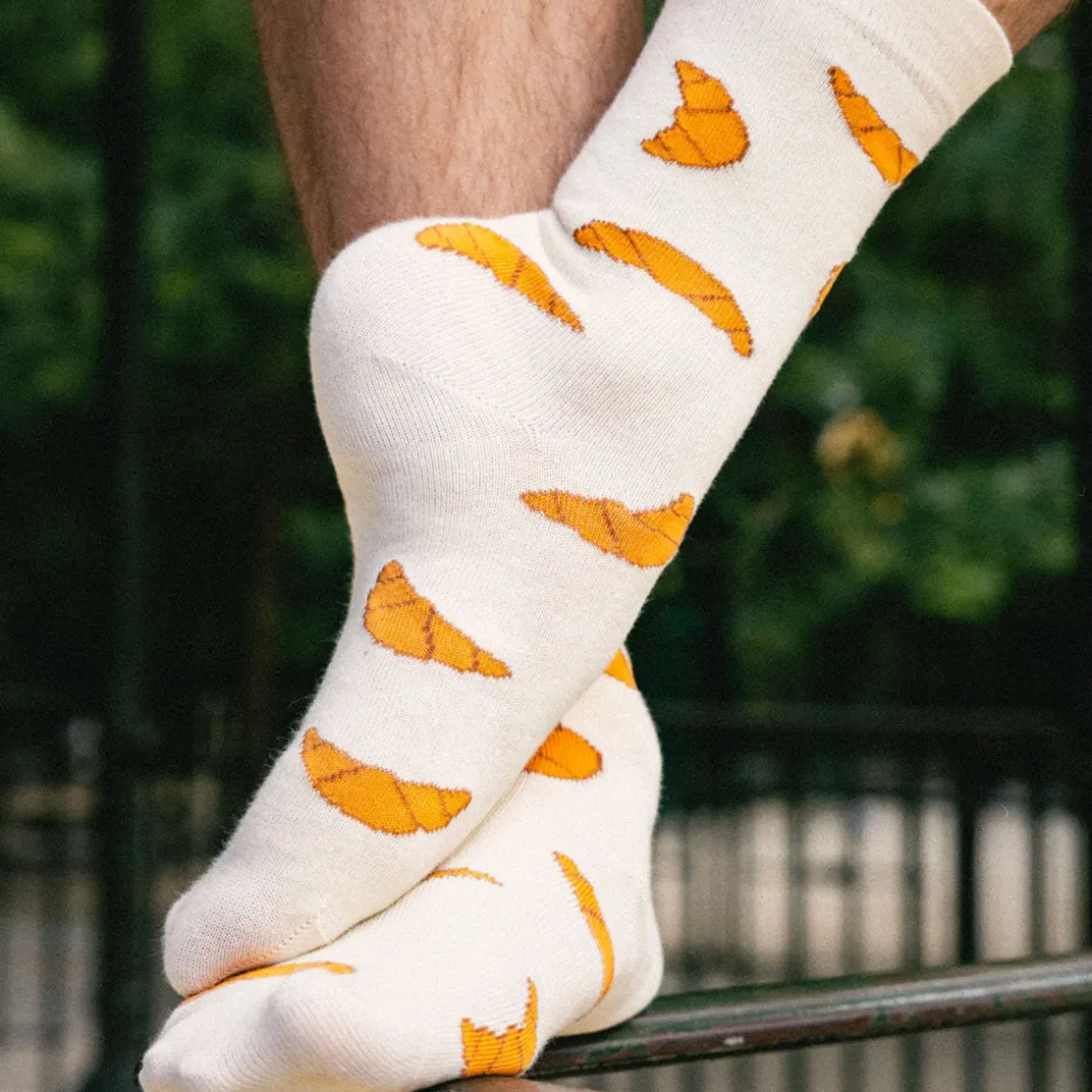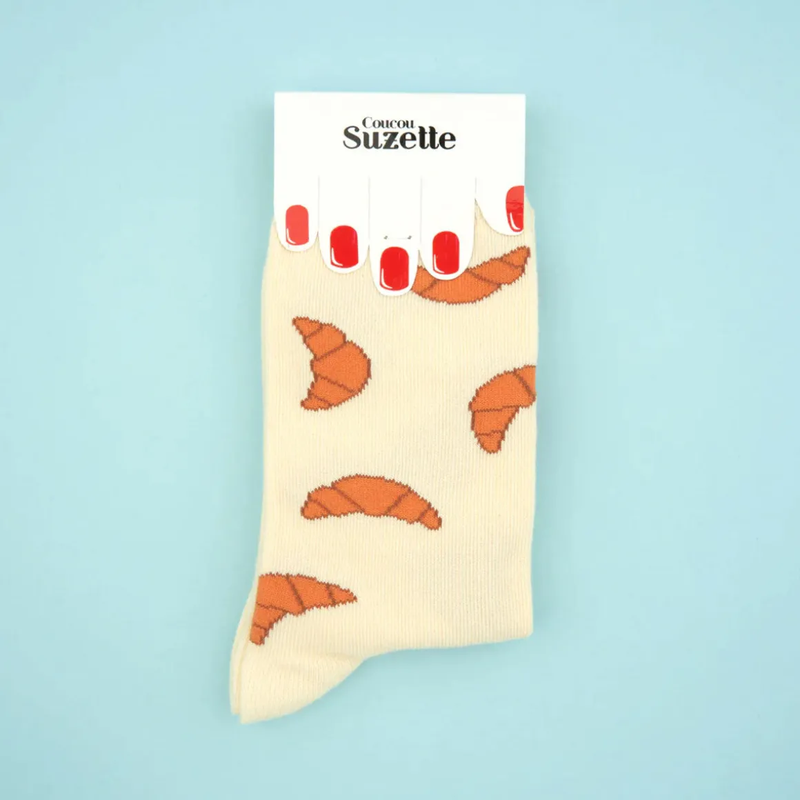 Rien de plus français que les Chaussettes Croissant de Coucou Suzette ! Ces chaussettes originales, ornées de délicieuses viennoiseries, apportent une touche de fun à vos tenues, sur un fond crème épuré et élégant.