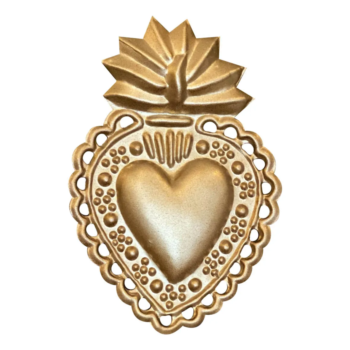 Un coeur sacré plein d’amour pour orner vos murs de belles intentions ! Cette collections d’exvotos rayonnera à vos murs. Faite de fer blanc embossé, patiné à la main, ce qui lui donne cette jolie couleur et son coté ancien, cette décoration murale est l’oeuvre d’un artisan, ainsi chaque coeur est unique par le grain, la patine. Cet objet de décoration mural et symbolique, à l’origine suspendu dans une église, un lieu vénéré, à la suite d’un vœu ou en remerciement d’une grâce obtenue, viendra s’accrocher joyeusement dans notre vie. Disponible en plusieurs modèles.