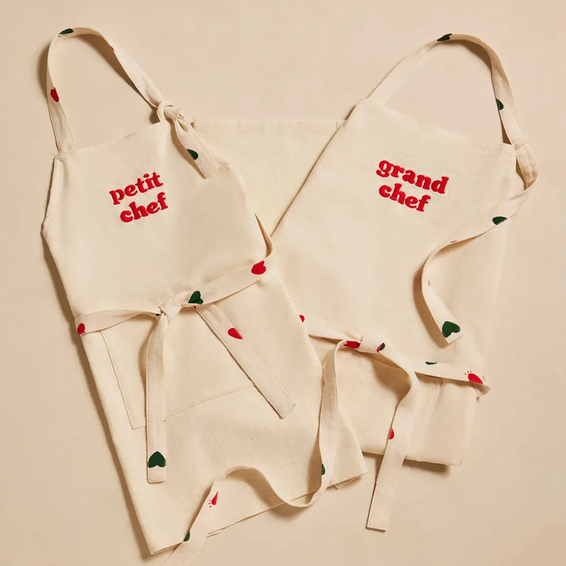 L’imprimé cœurs rouge et vert embellit les liens ajustables au cou et à la taille, tandis que la broderie « Petit Chef » en rouge apporte une touche de charme aux jeunes cuisiniers en herbe.
