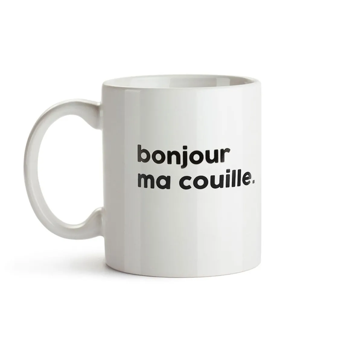 Tasse « Bonjour ma couille » de Félicie Aussi. Résolument atypique, la collection de gobelets et tasses signée Félicie Aussi mise sur un lettering ludique et plein d’humour. Pour des petits-déjeuners ou des pauses café décalés, ces accessoires de table made in France offrent une esthétique la fois pop, contemporaine et délicate. Entre petits noms doux et tendres injures, trouvez la tasse idéale (ou pas) pour vos proches ! Disponible en plusieurs modèles. Fabriqué en France.
