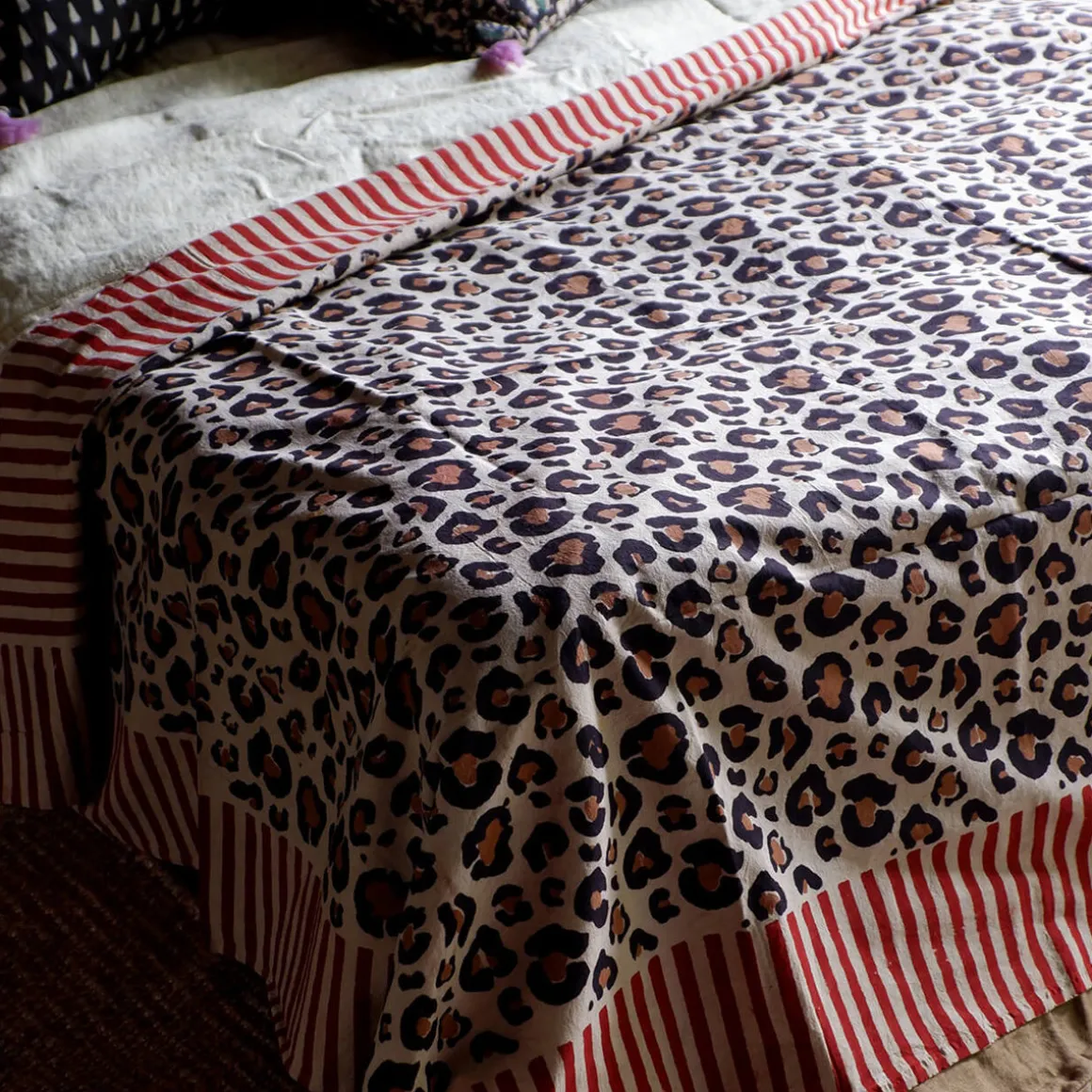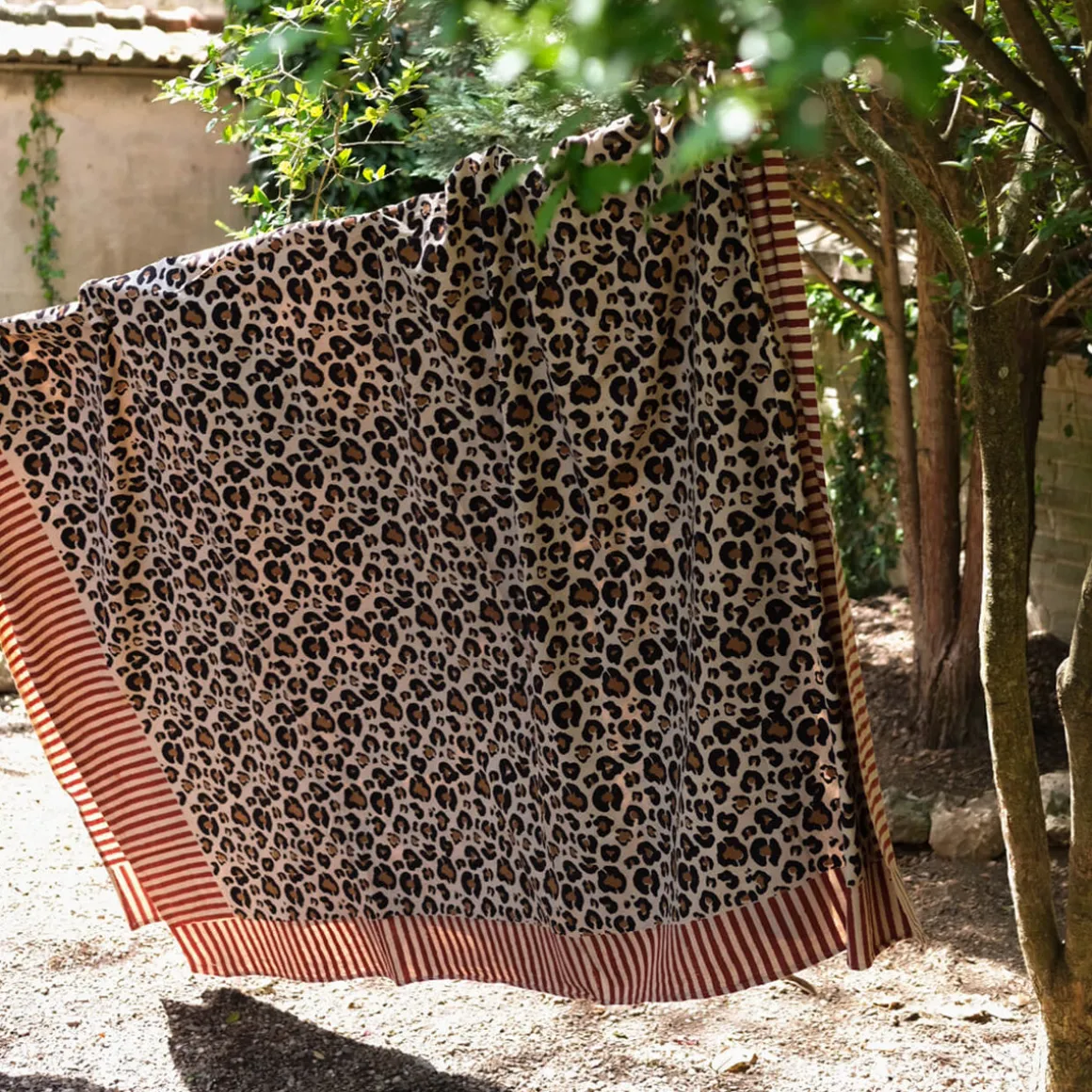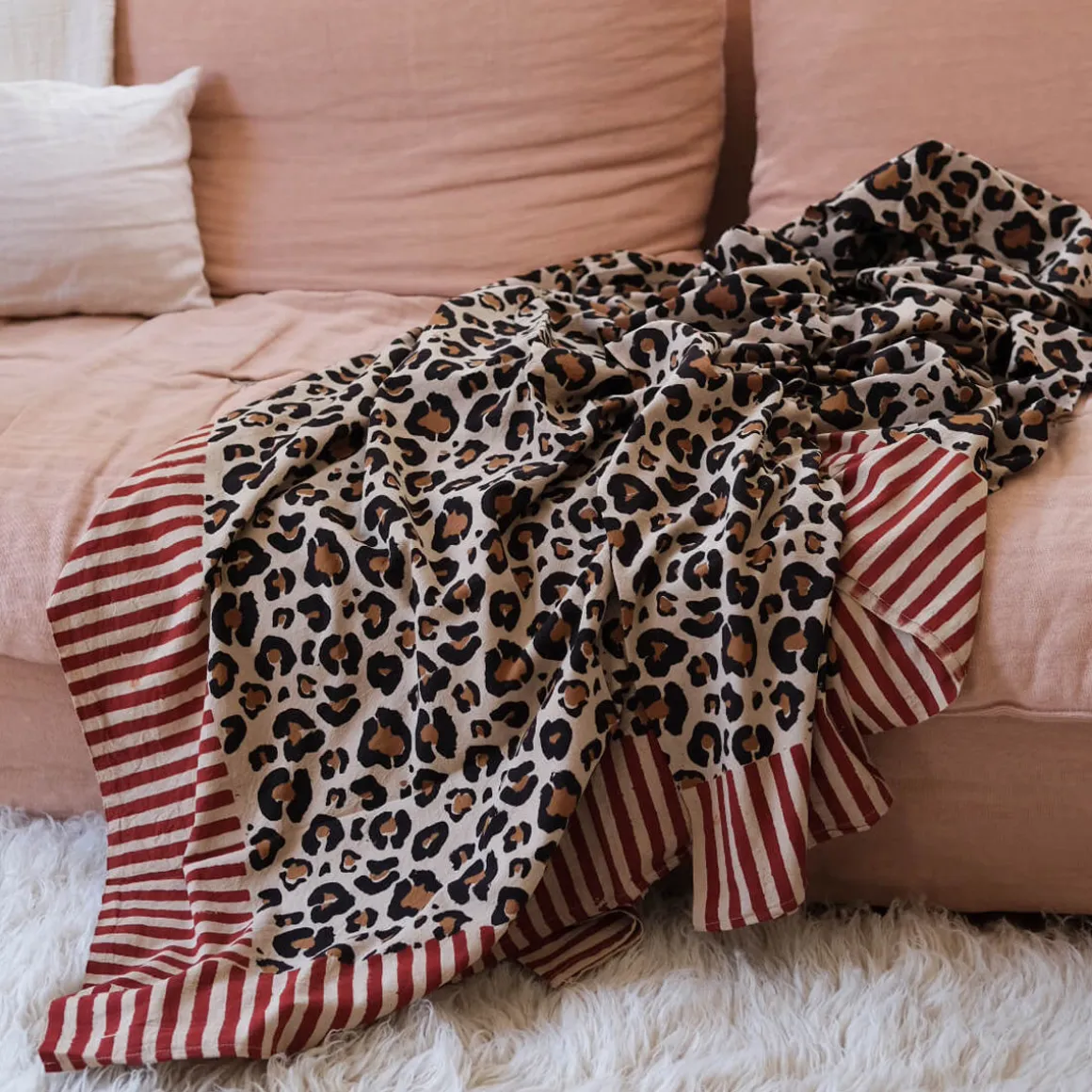 Ce plaid Léopard Simple ou Double est imprimé à la main avec des blocs de bois sculptés et s’adapte à différents usages. Déposez-le sur votre lit, sur votre canapé ou emmenez-le avec vous pour une journée à la plage ou lors d’un pique-nique avec son tote-bag assorti !
