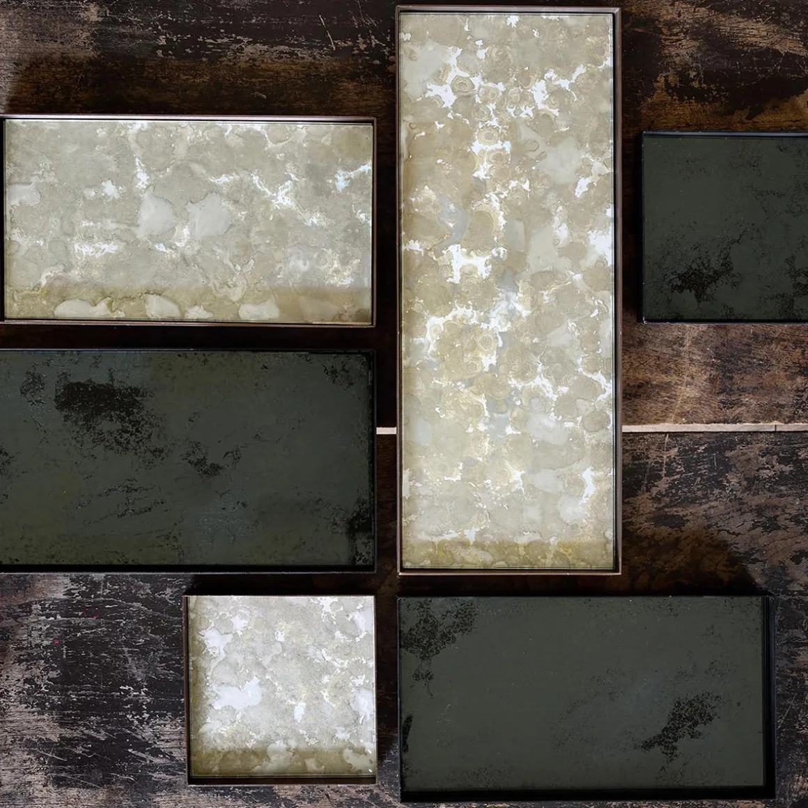 Le plateau fortement vieilli en miroir teinté foncé et bord en bois, peut être posé délicatement sur une table ou encore utilisé pour habiller un mur.