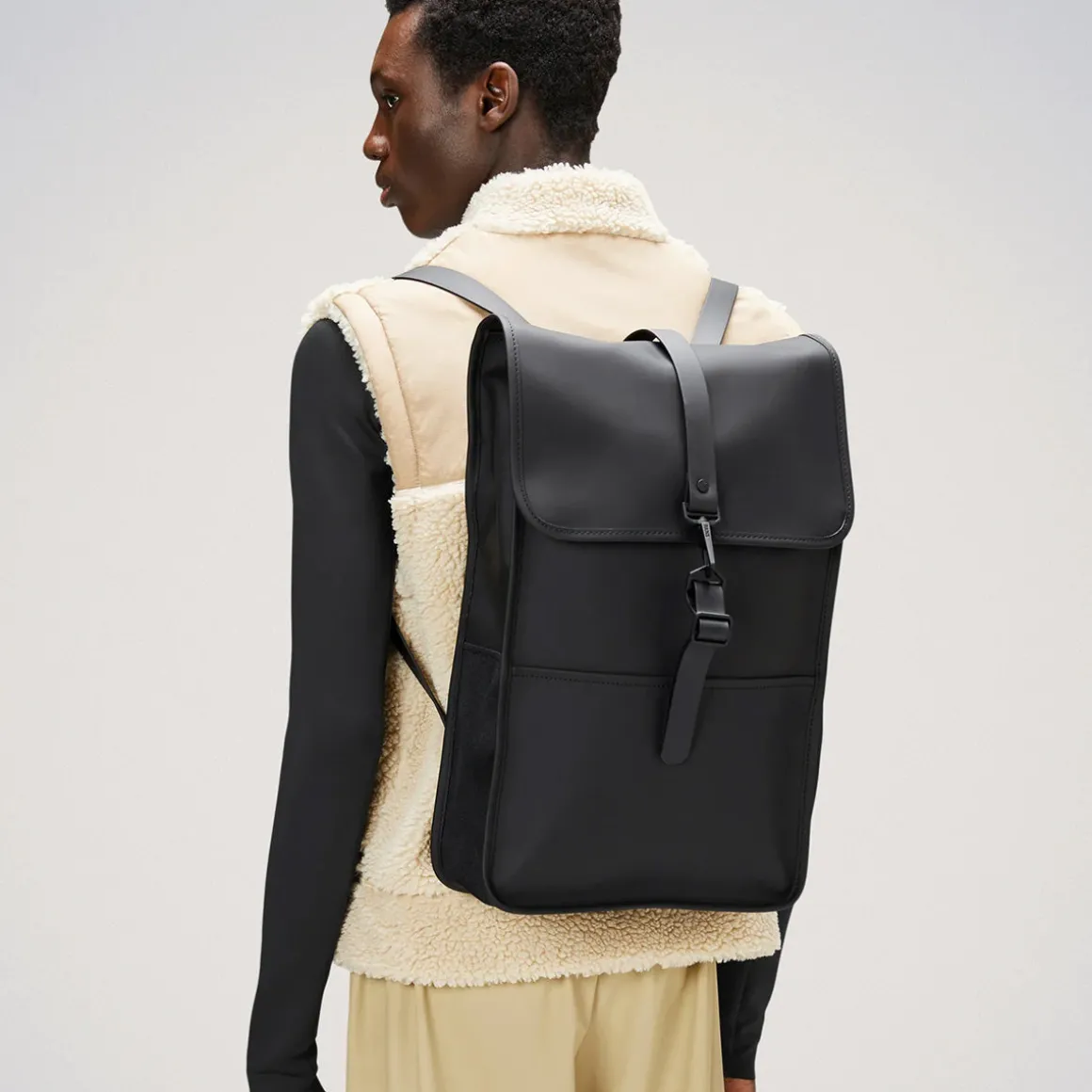 Avec son rabat proéminent, sa sangle centrale et sa fermeture à mousqueton, le sac à dos Backpack décliné en noir est un grand classique de Rains. Ce sac à dos imperméable, épuré et moderne possède un compartiment intérieur pour ordinateur portable, un compartiment principal spacieux ainsi qu’une pochette invisible pour téléphone portable au niveau du pan arrière.n