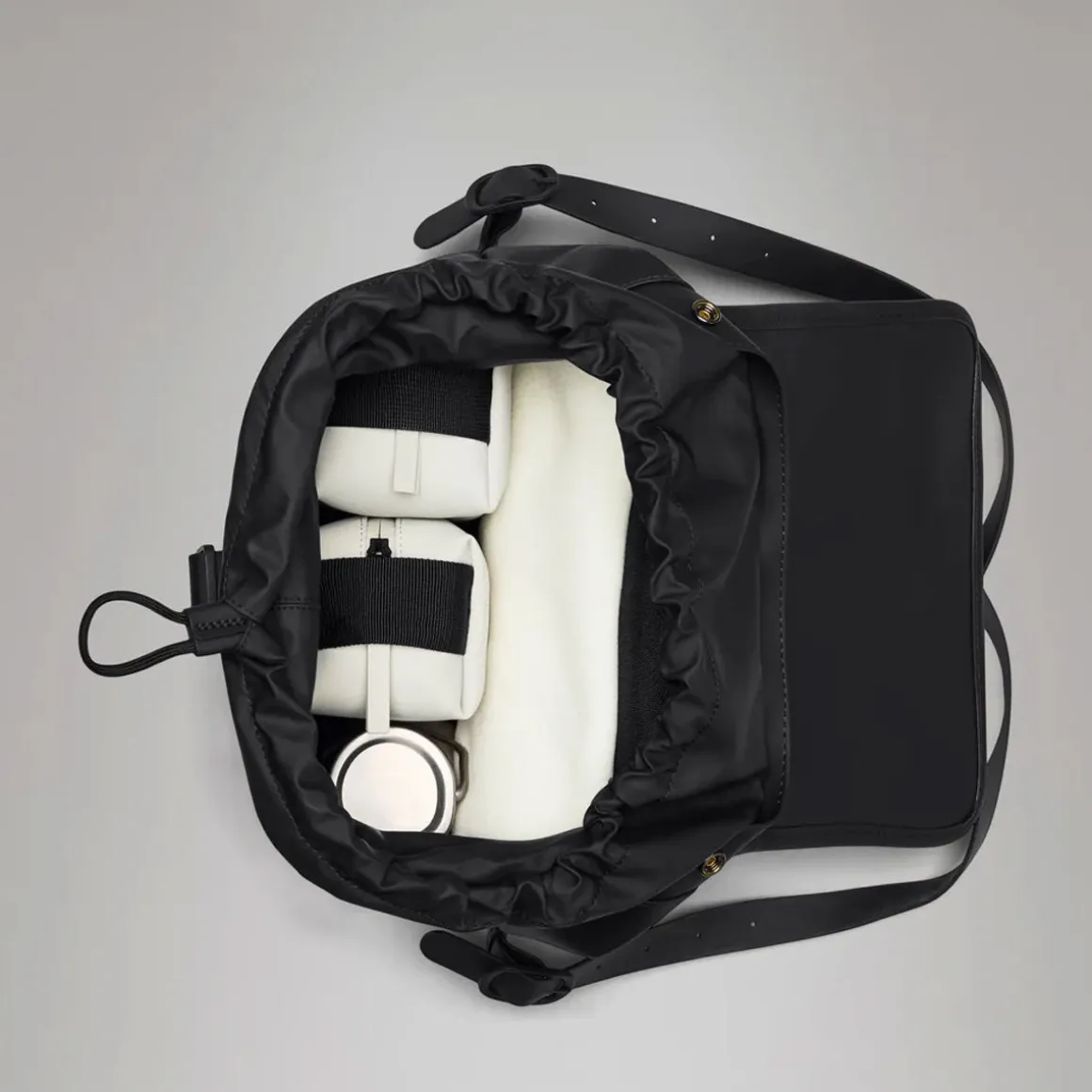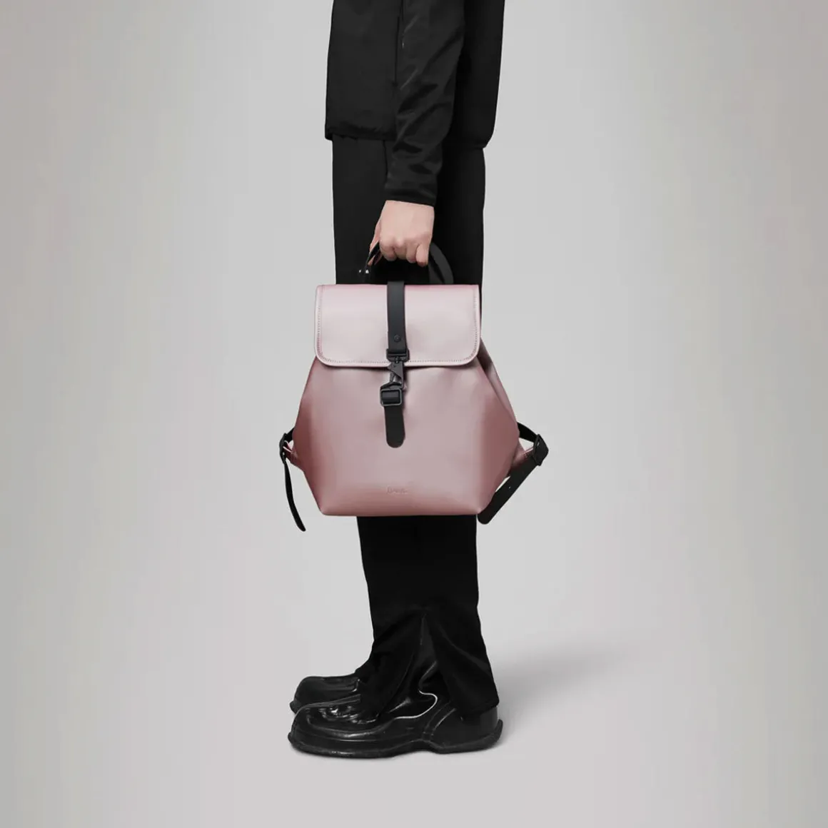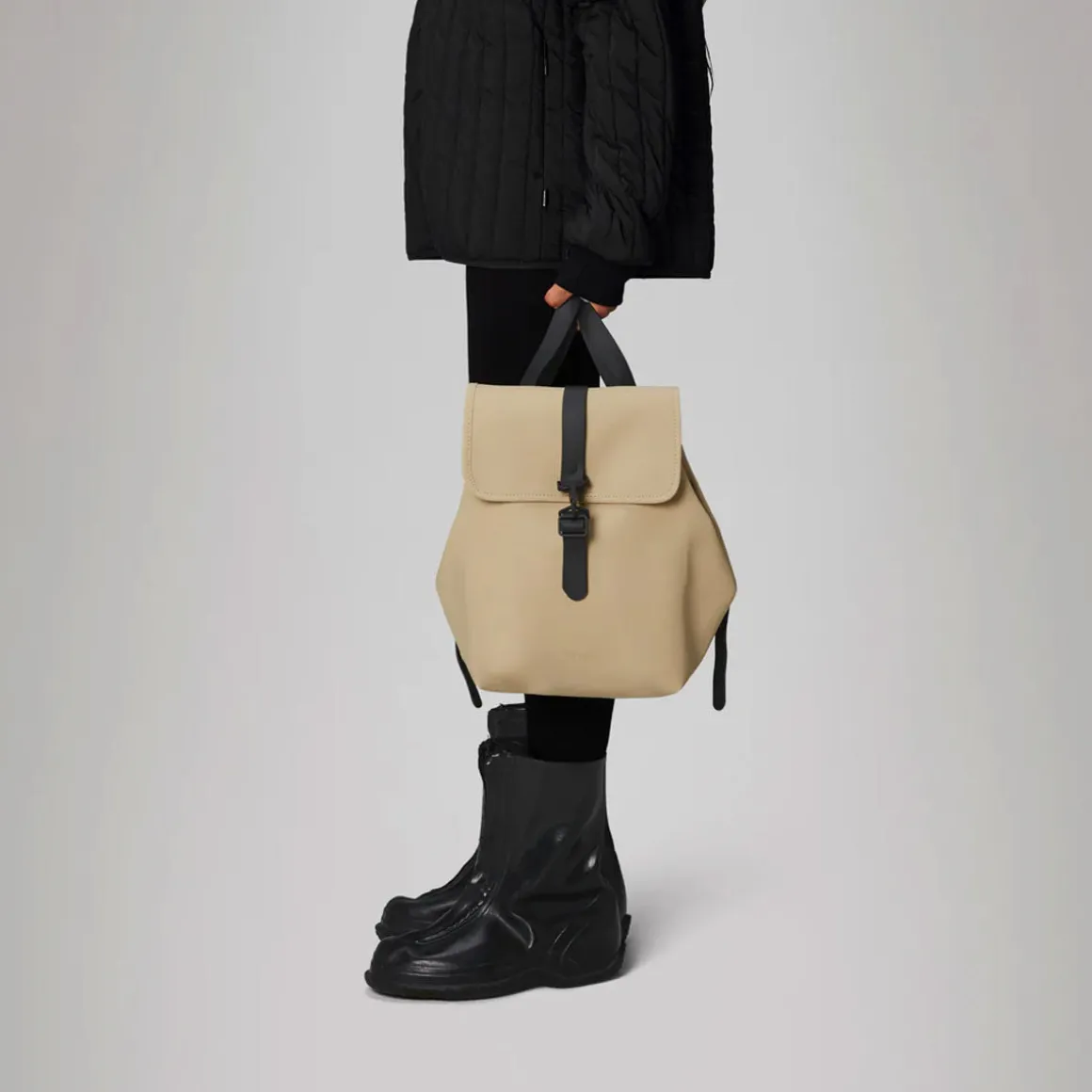 Des sangles en TPU s’attachent sur les côtés pour un style décontracté. Le sac à dos Bucket comprend un compartiment principal avec une poche zippée pour les petits accessoires, ainsi que des boucles et mousquetons signés Rains.