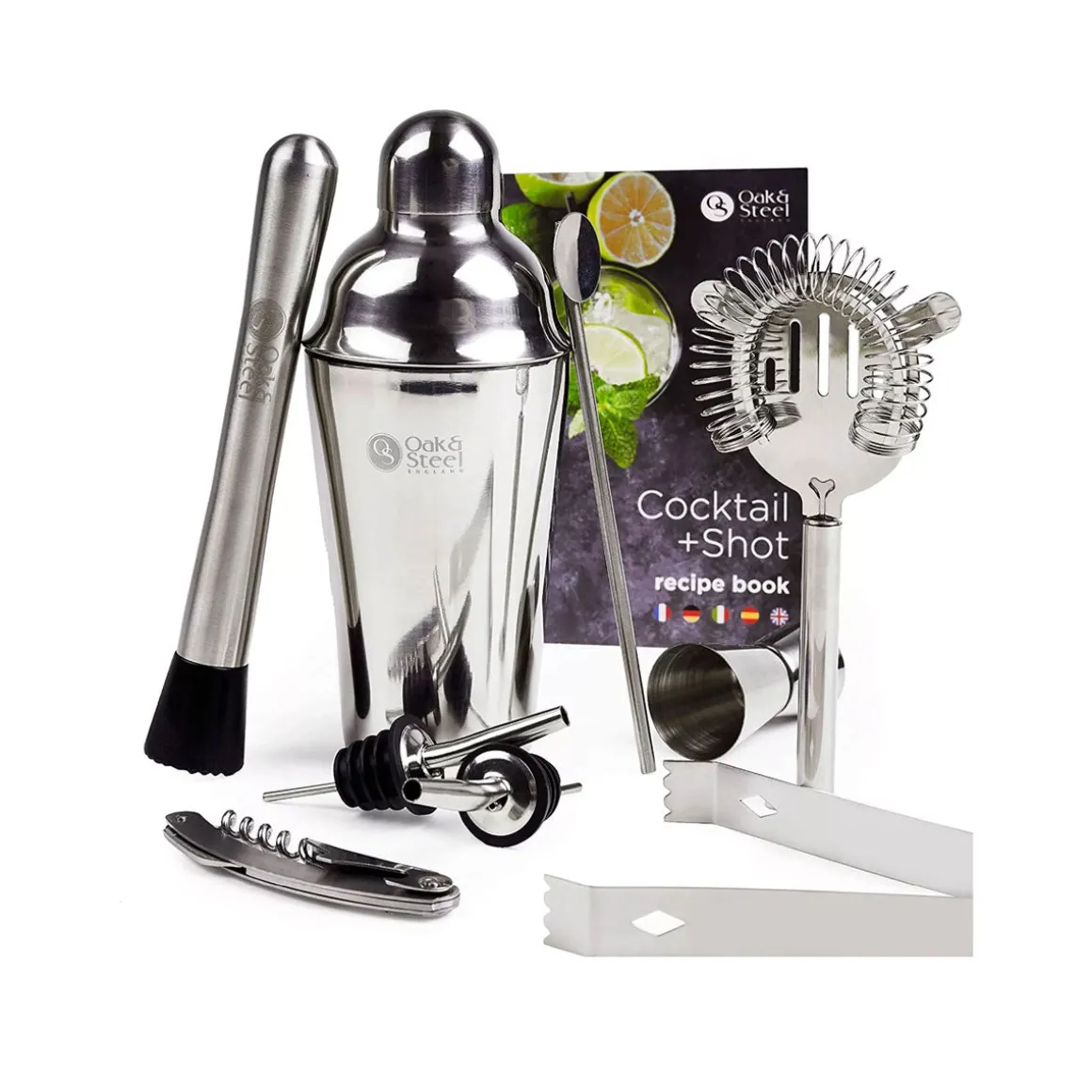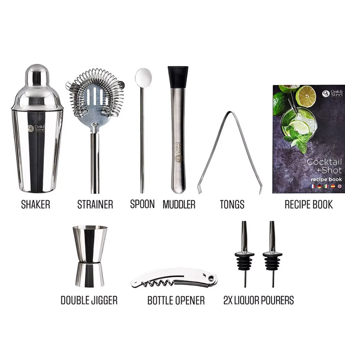Que vous soyez débutant ou professionnel, ce kit fera effet auprès de votre entourage. Il contient un grand shaker à cocktail, un pilon, un doseur, une passoire Hawthorne, une pince à glace, une cuillère à barre torsadée, un décapsuleur multi-outils, un bec verseur, des tasses à mesurer 25 ml et 50 ml et un livre de recettes avec section Extra Shots. Tous ces ustensiles sont en acier inoxydable, faciles à nettoyer et de qualité supérieure.
