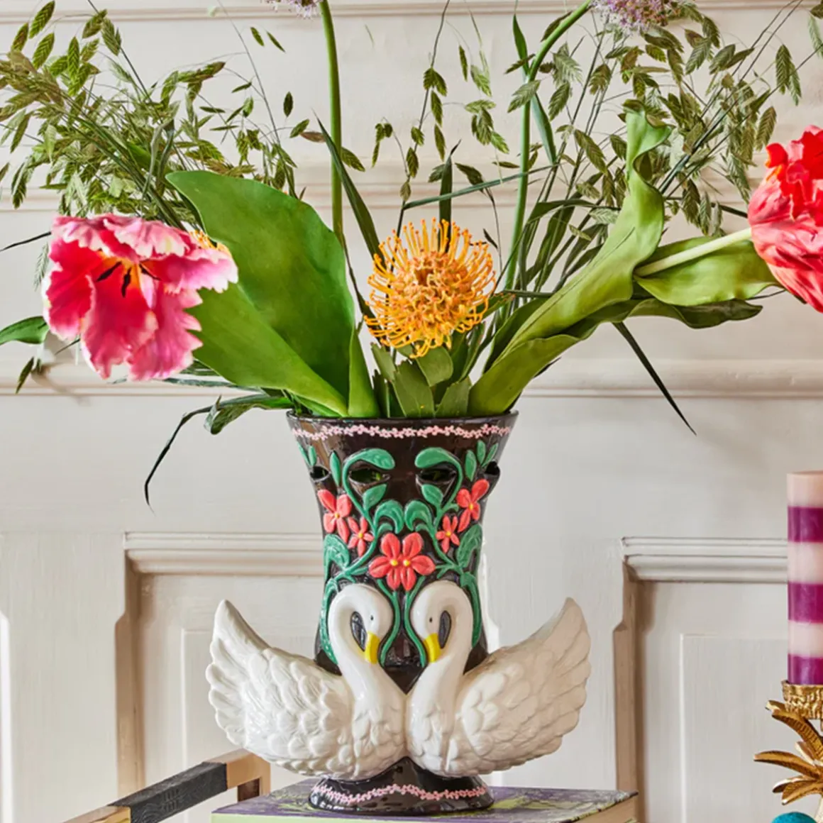 Un vase ravissant et incroyablement original, orné de deux magnifiques cygnes entourés de fleurs colorées. Sa forme unique imaginée par Rice le rend absolument charmant, et nous sommes certains que vous l’adorerez autant que nous. Utilisez-le dans votre cuisine, votre salon, ou votre entrée pour apporter une touche de magie au quotidien !