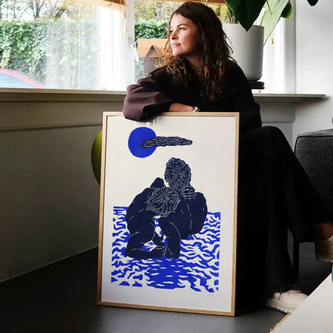 Plongez dans l’intimité et l’émotion de l’œuvre Blue Moon II de Marion Livran. Cette affiche représente deux hommes enlacés sur un fond bleu profond, avec des motifs aquatiques tourbillonnants évoquant la fluidité et la connexion.
