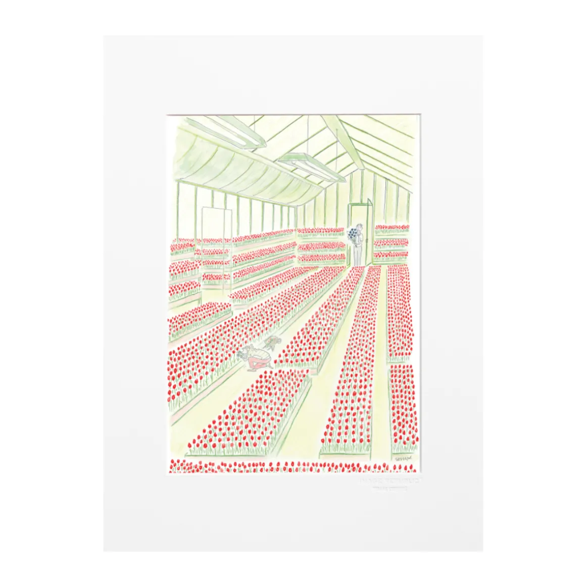 Dans cette composition, Sempé met en scène des allées de tulipes rouges soigneusement alignées, contrastant avec un bouquet luxuriant de tulipes bleues, qui semblent éclore comme une déclaration d’amour inattendue. À travers cette juxtaposition de couleurs et de formes, l’artiste célèbre la beauté de la nature, tout en y insufflant une note d’extravagance douce et malicieuse, signature de son humour décalé.