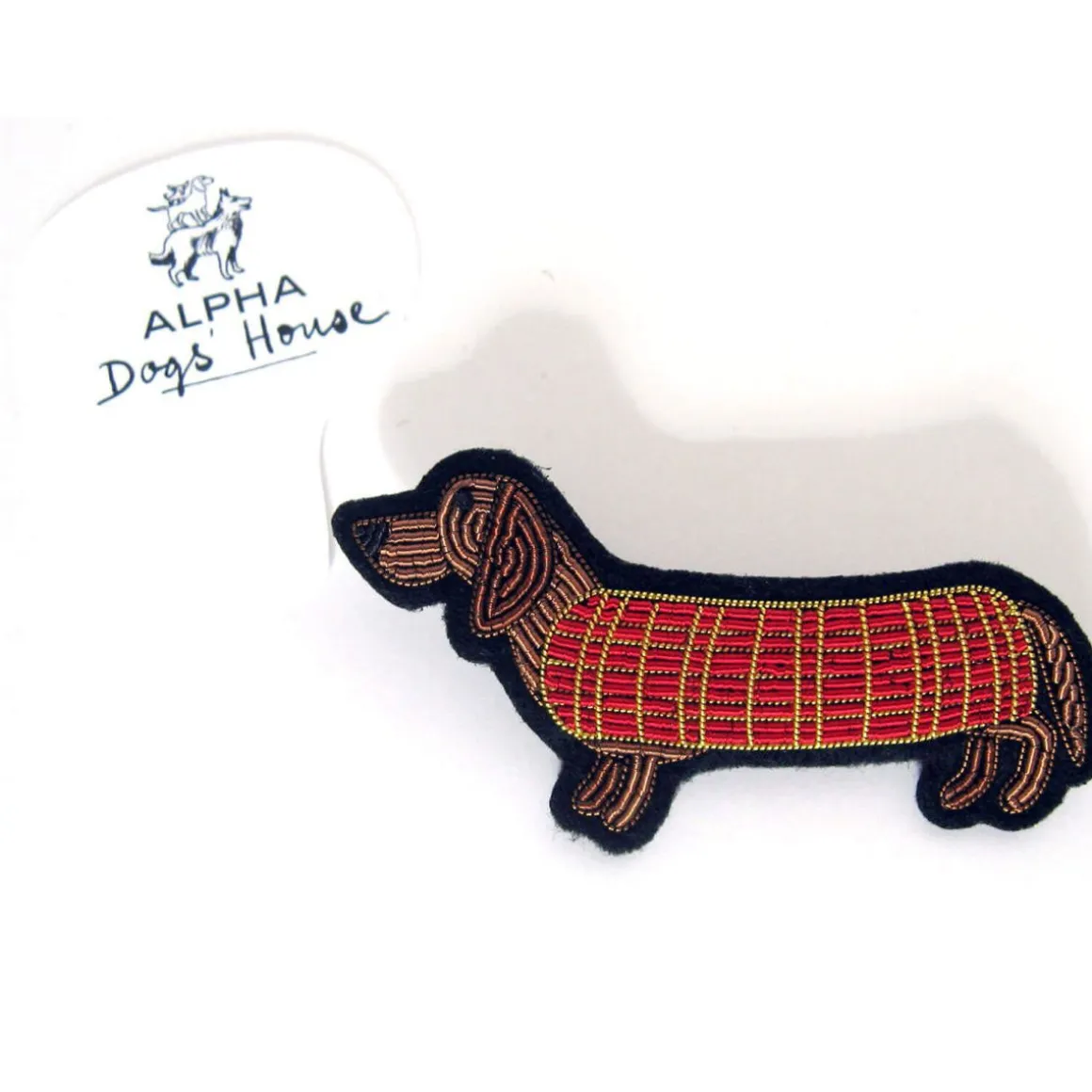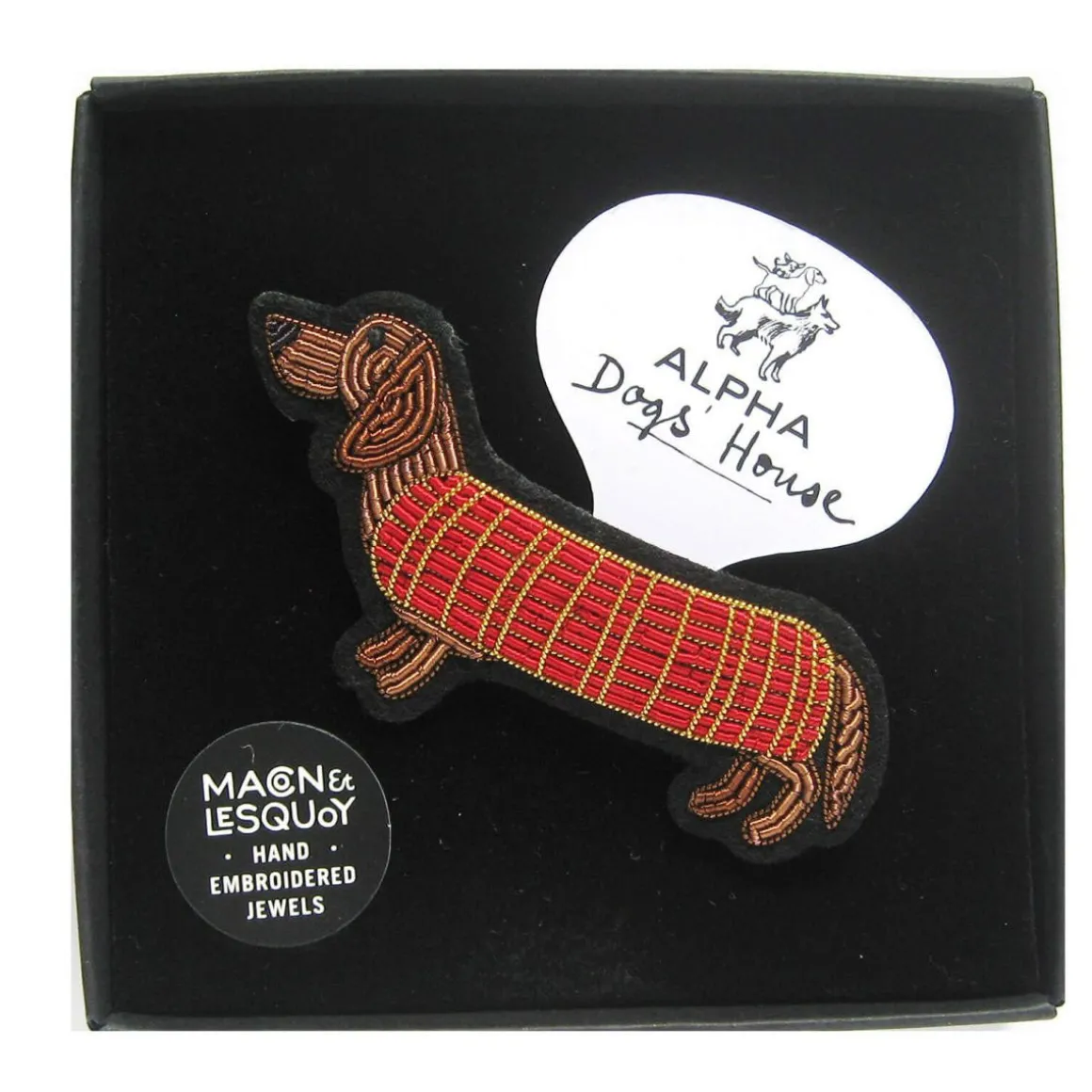 Macon u0026amp; Lesquoy présente la Broche Teckel, un petit chien au style irrésistible, vêtu de son pull cosy.