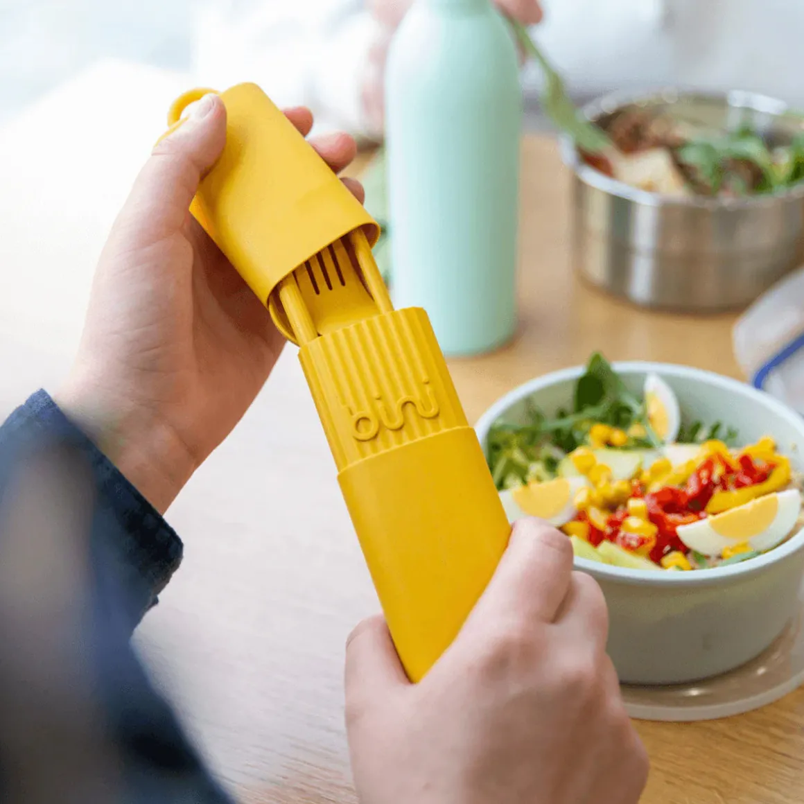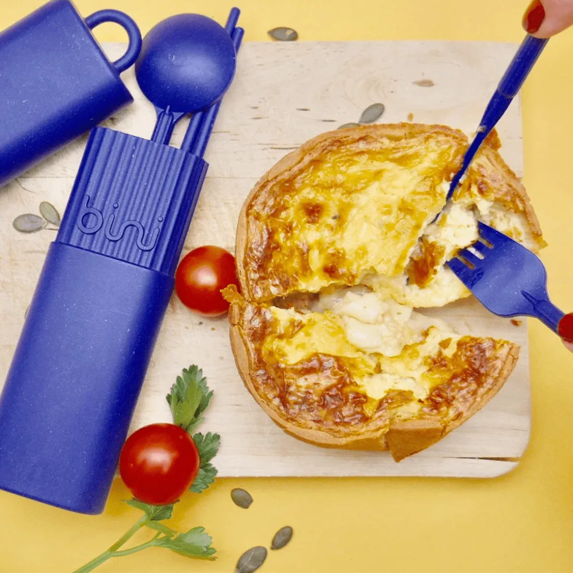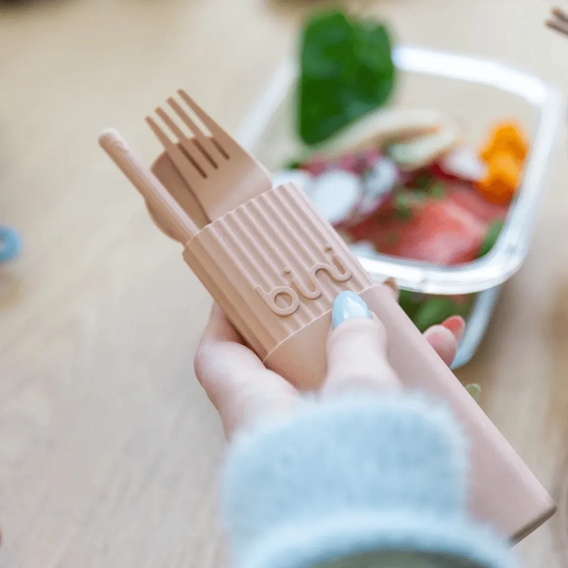 Dans l’ensemble de couverts nomades et réutilisables Bini, il y a une fourchette qui pique vraiment, un couteau qui coupe parfaitement, des baguettes qui saisissent bien, une cuillère creuse pour de belles cuillerées (si quelqu’un a déjà compris le concept des cuillères plates, appelez-nous), dans un petit étui léger, nomade et ingénieux. Bref, des couverts réutilisables bien pensés, ni trop petits comme ceux pour les enfants, ni trop encombrants comme ceux dans le tiroir de la cuisine.