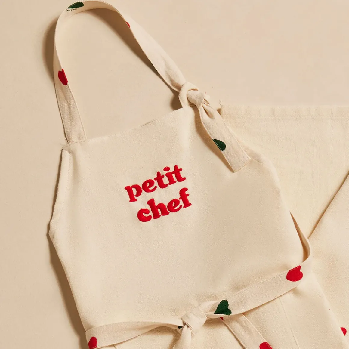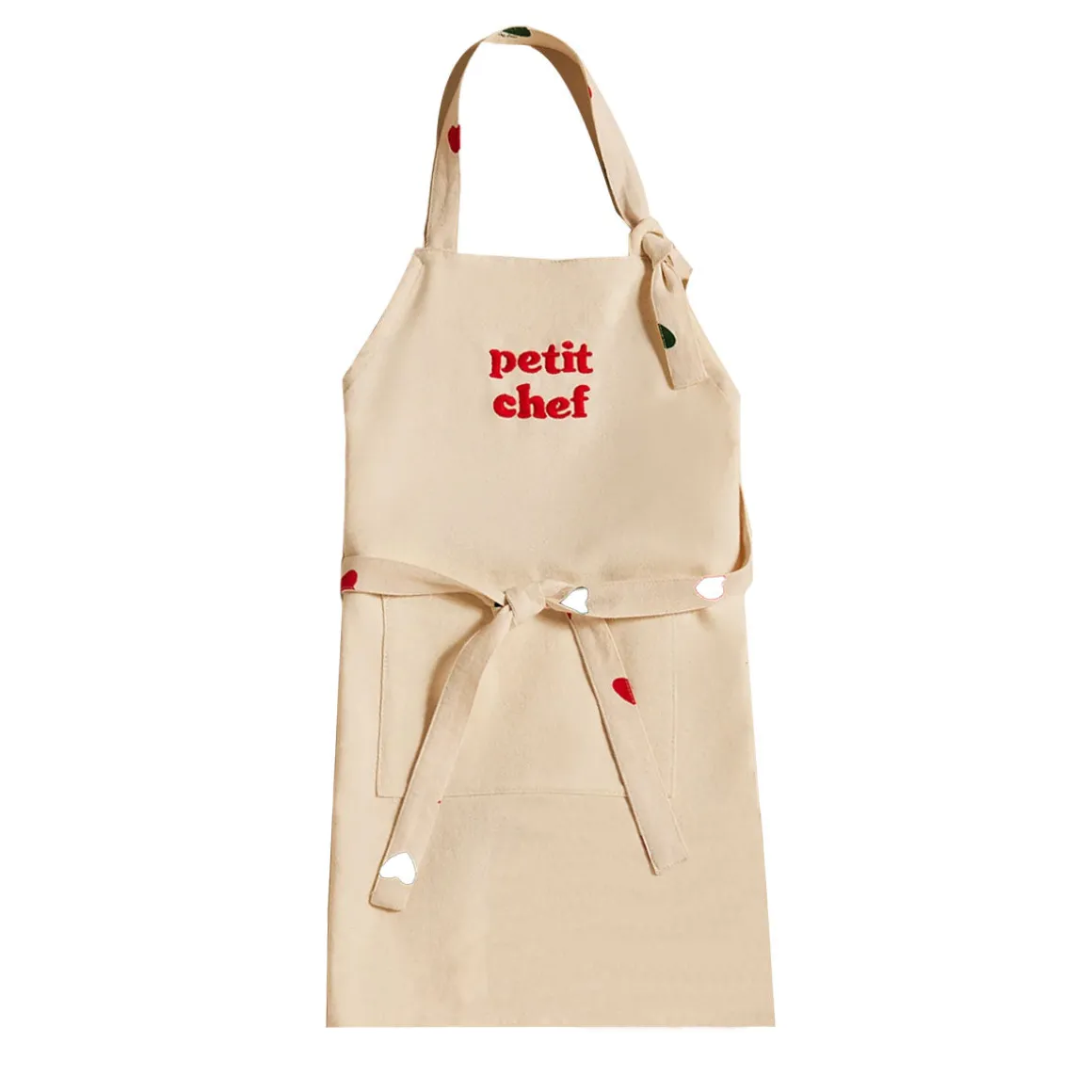 L’imprimé cœurs rouge et vert embellit les liens ajustables au cou et à la taille, tandis que la broderie « Petit Chef » en rouge apporte une touche de charme aux jeunes cuisiniers en herbe.
