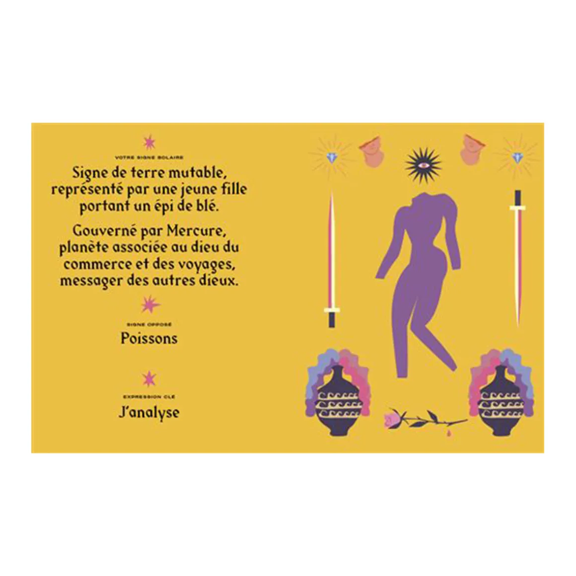 La Vierge est un signe de terre mutable et observateur, orienté vers les détails. Sous l’influence de Mercure, la Vierge bénéficie d’un intellect pointu. Découvrez dans ce livre sur l’astrologie de l’édition Hachette de Stella Andromeda tous les secrets de votre signe astrologique. Comprenez pourquoi vous réagissez d’une façon ou d’une autre et percevez à jour les mystères du pouvoir du zodiaque.