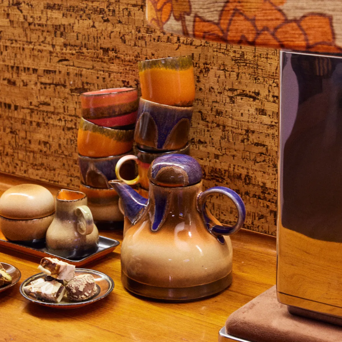 La palette riche et chaleureuse et les motifs groovy créent un festin visuel qui vous invite à savourer votre café dans un véritable style vintage.