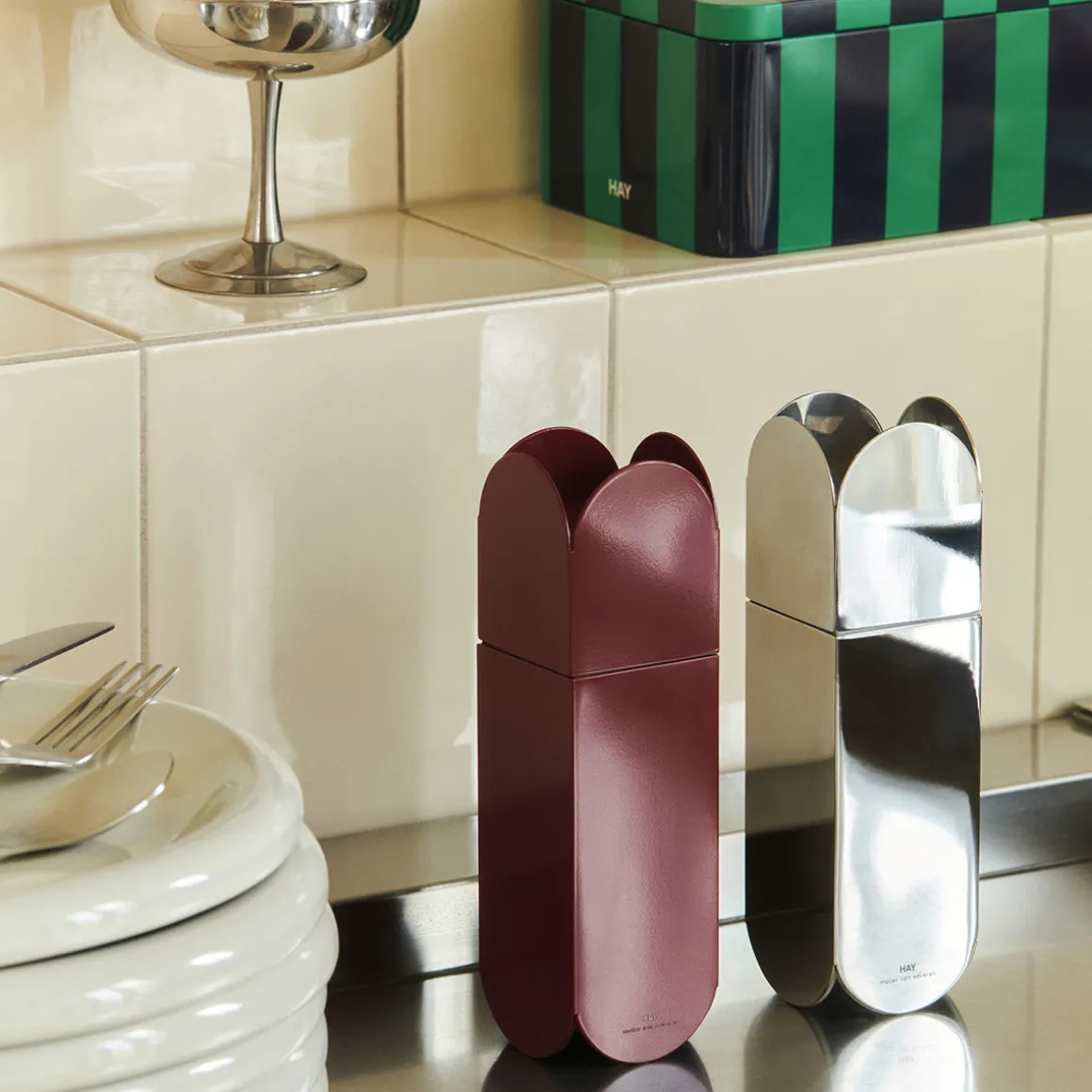 Conçus par le duo belge Muller Van Severen, les moulins à sel et à poivre Arcs se caractérisent par leur succession d’arcs. Ils deviennent un essentiel de cuisine fonctionnel avec une silhouette élégante et festonnée. Fabriqués en acier inoxydable avec une finition miroir ou des options de couleurs très brillantes, les moulins ajoutent une touche décorative lorsqu’ils sont exposés sur les étagères de la cuisine, les tables à manger et autres surfaces de la maison.