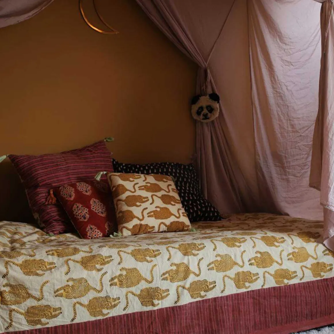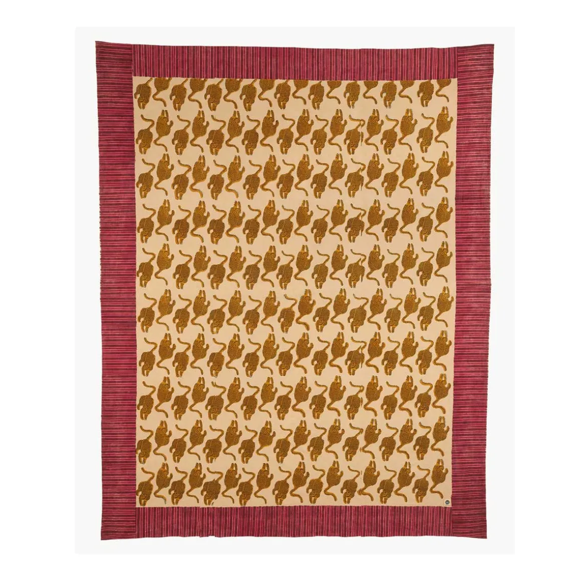 Ce plaid Tiger Simple ou Double est imprimé à la main avec des blocs de bois sculptés et s’adapte à différents usages. Déposez-le sur votre lit, sur votre canapé ou emmenez-le avec vous pour une journée à la plage ou lors d’un pique-nique avec son tote-bag assorti !