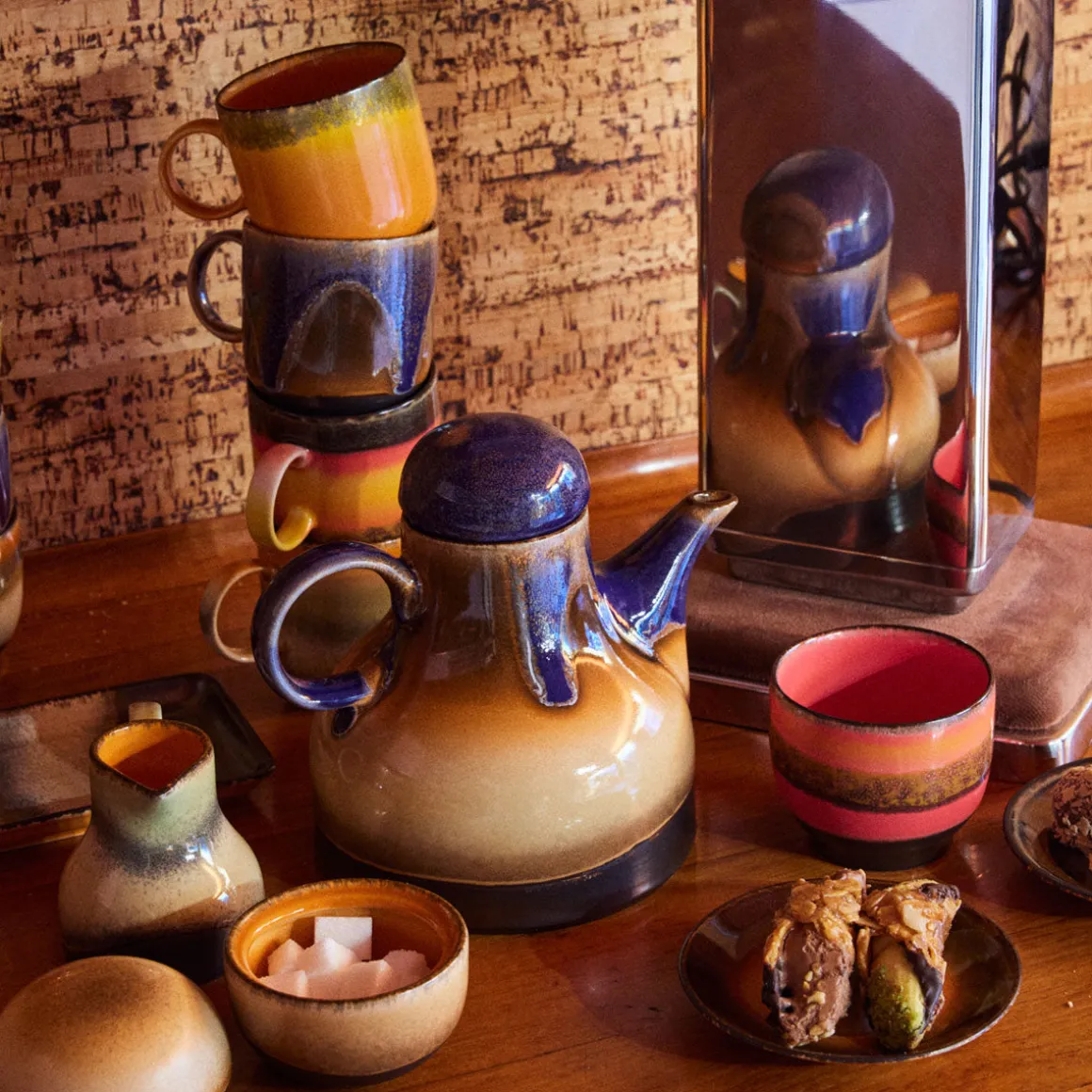 La palette riche et chaleureuse et les motifs groovy créent un festin visuel qui vous invite à savourer votre café dans un véritable style vintage.