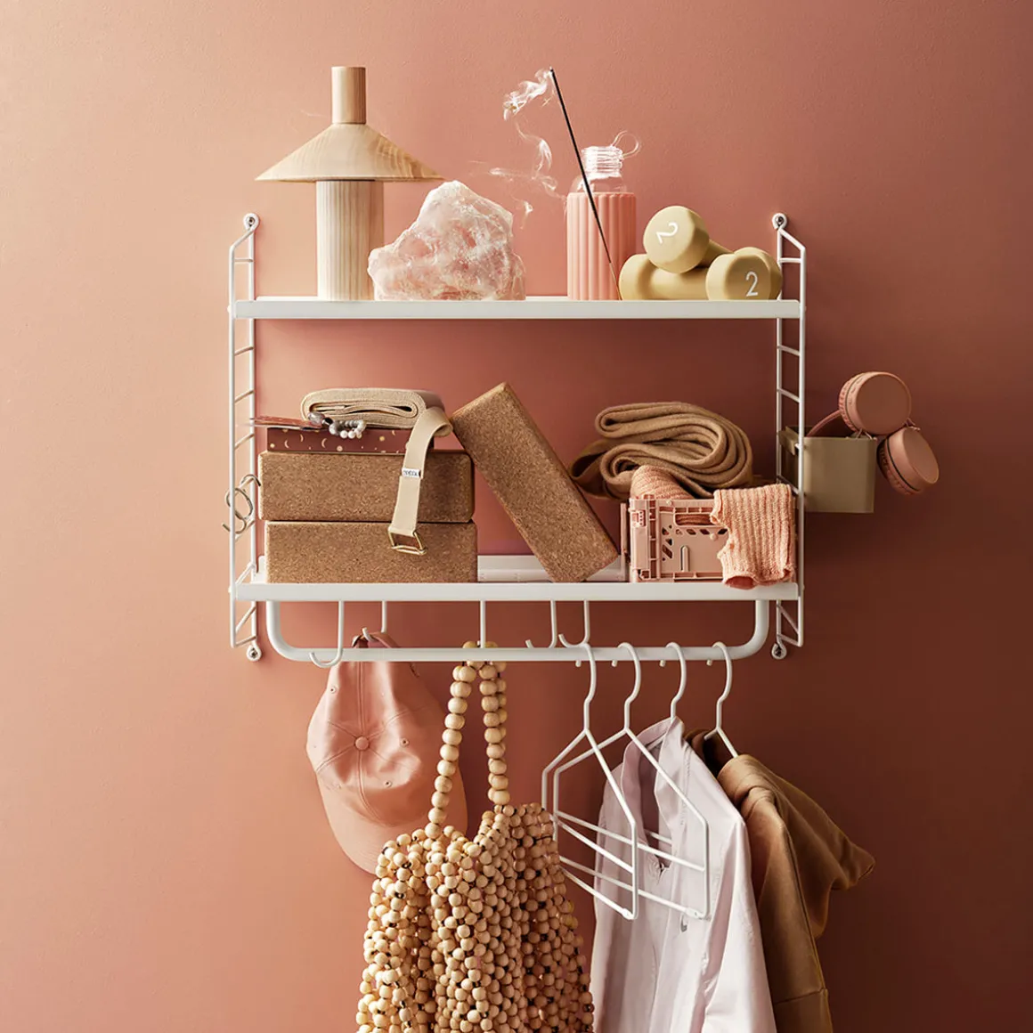 Le tout-en-un ! Le rangement mural Hallaway est idéal pour les petits couloirs. Il regroupe les essentiels dans une petite boîte. Deux étagères, deux panneaux, des portes-manteaux, des crochets, String Furniture a pensé à tout.