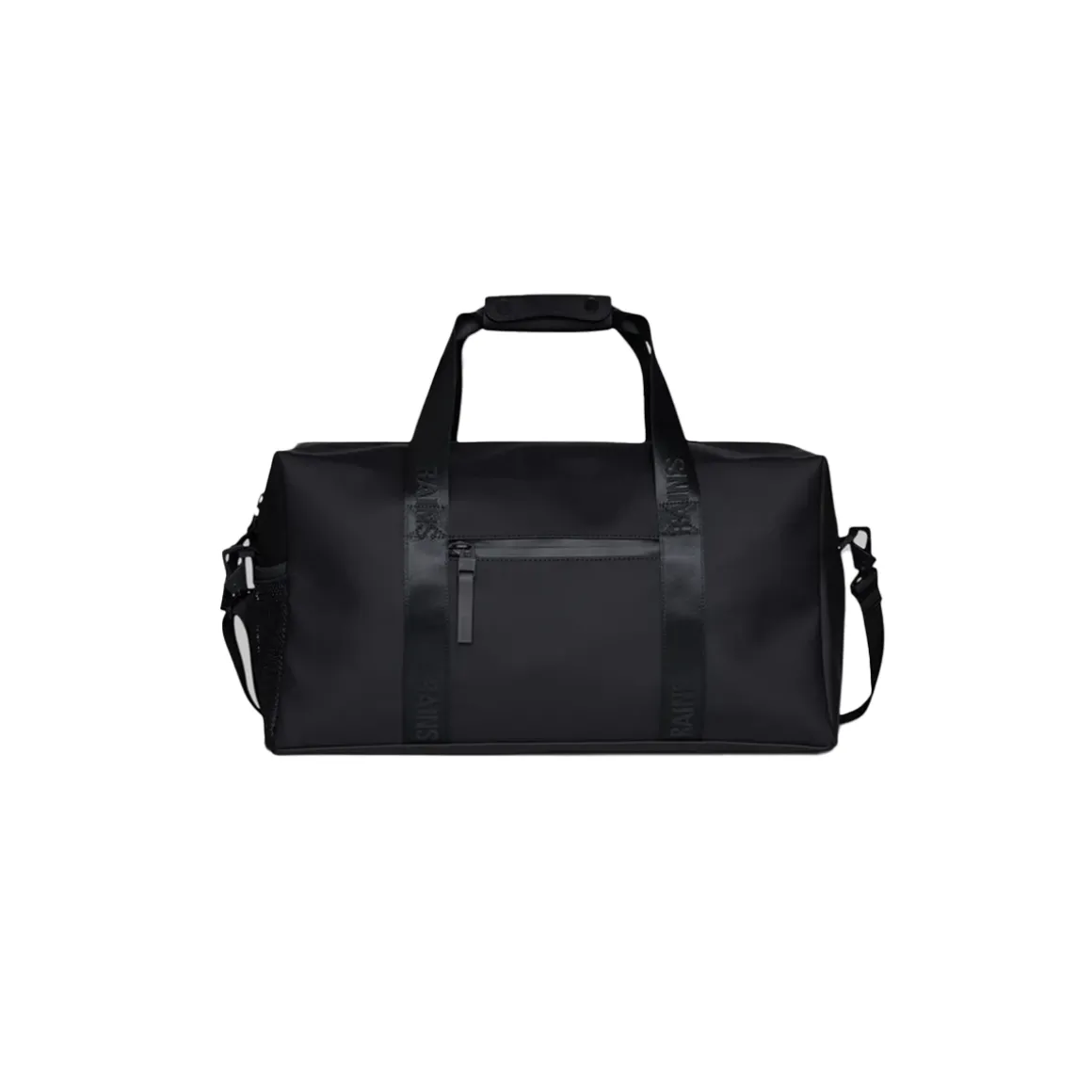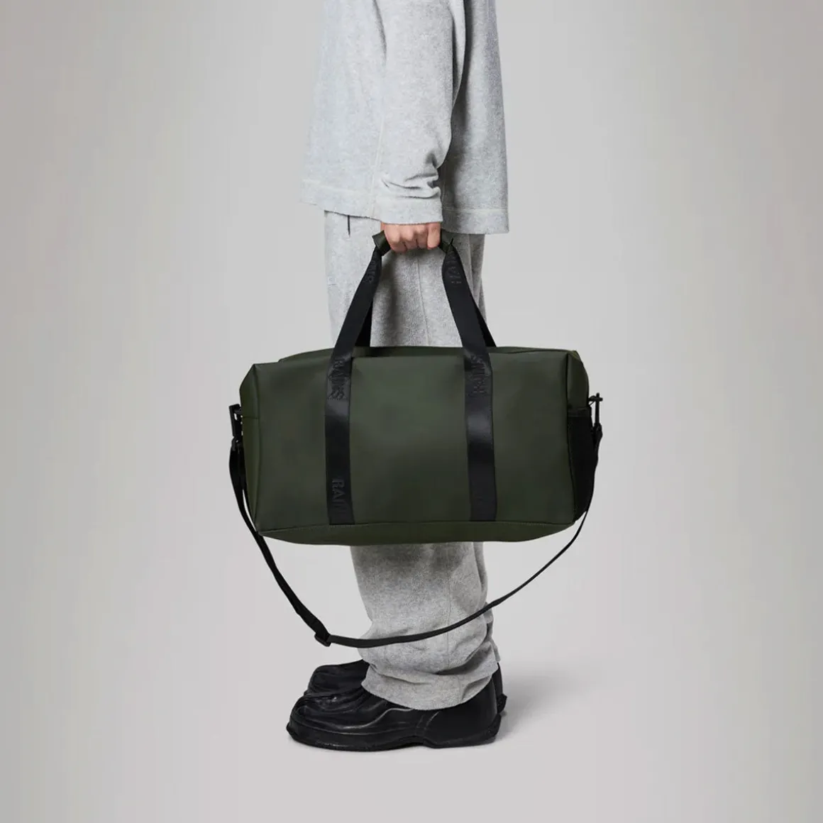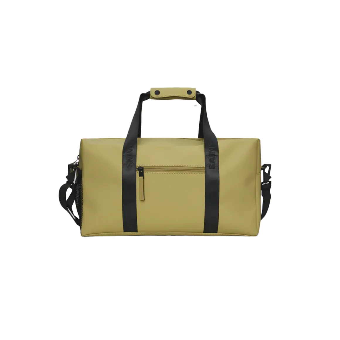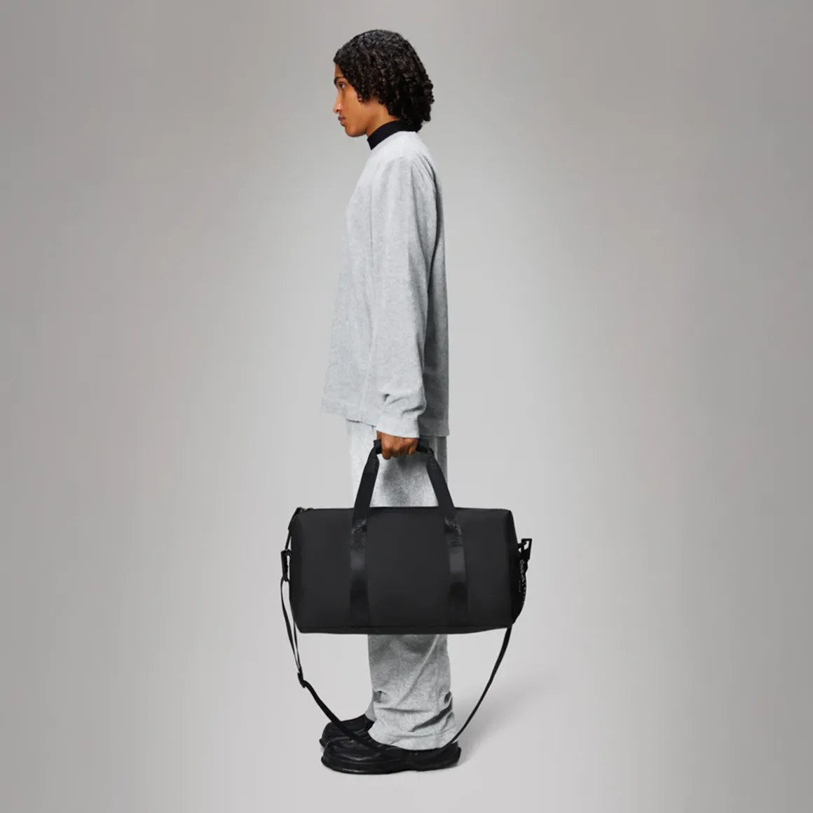 Le Gym Bag est confectionné en tissu PU emblématique et imperméable de Rains, offrant une résistance et une durabilité optimales pour un toucher ultra-doux.