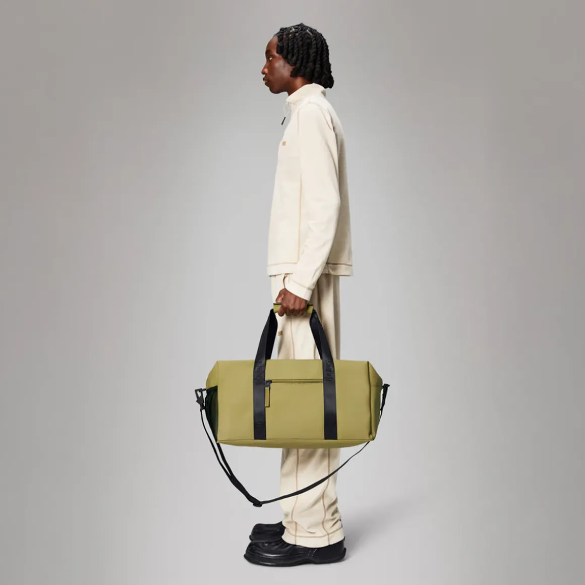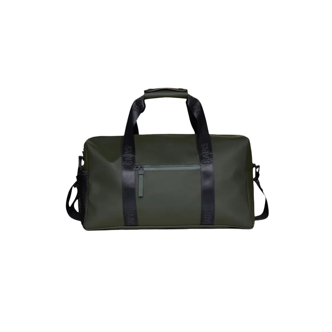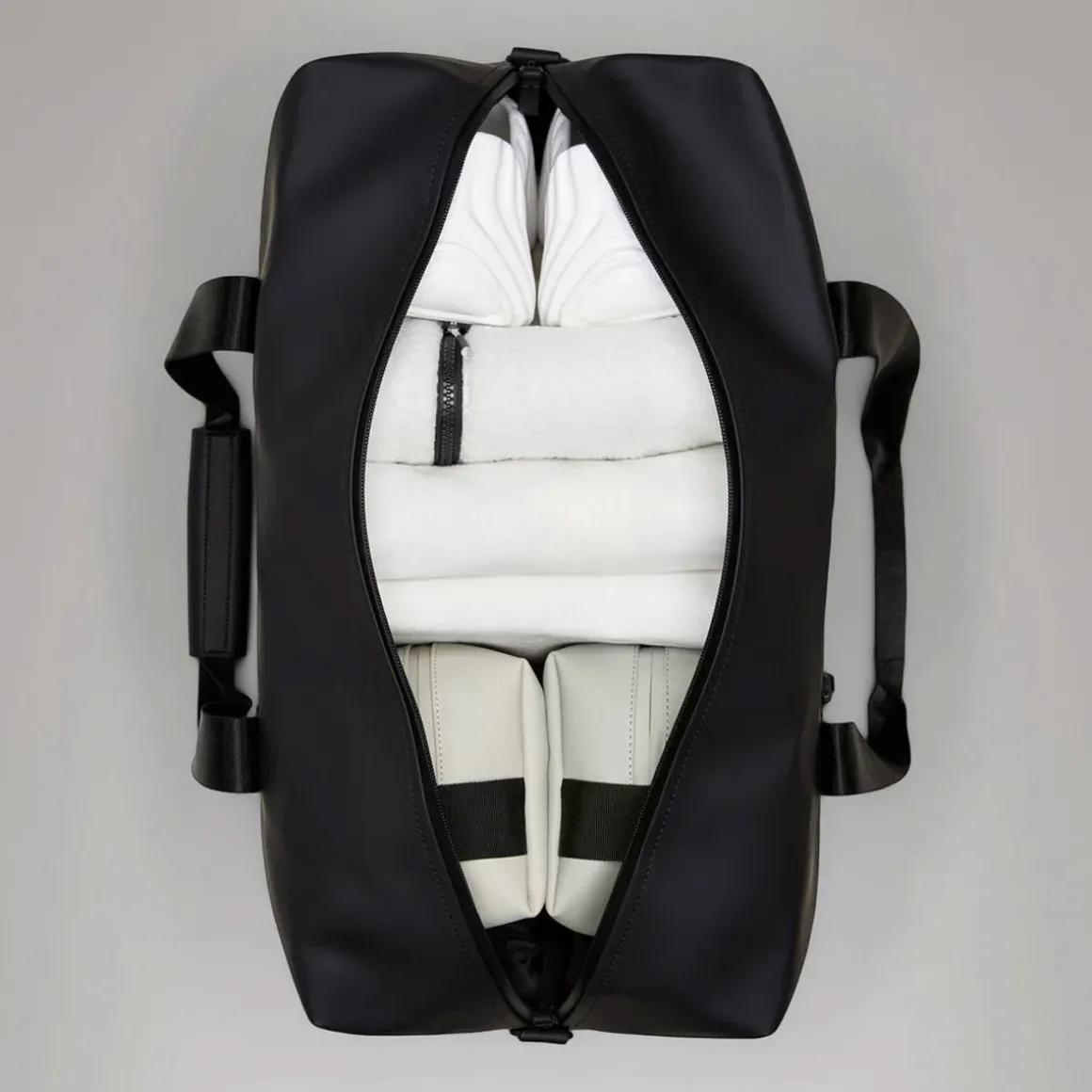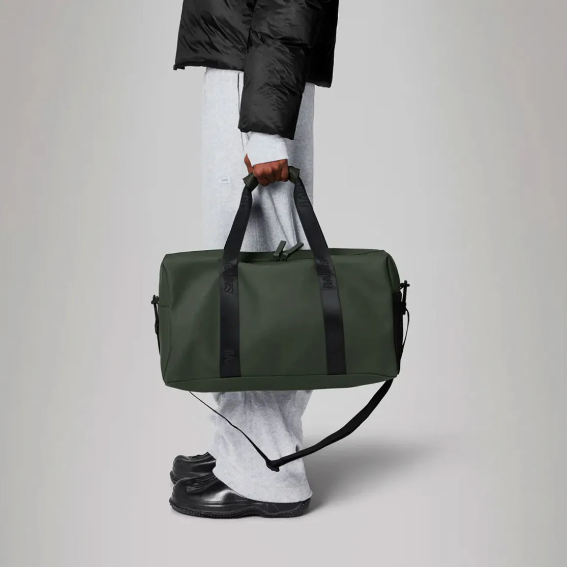 Le Gym Bag est confectionné en tissu PU emblématique et imperméable de Rains, offrant une résistance et une durabilité optimales pour un toucher ultra-doux.
