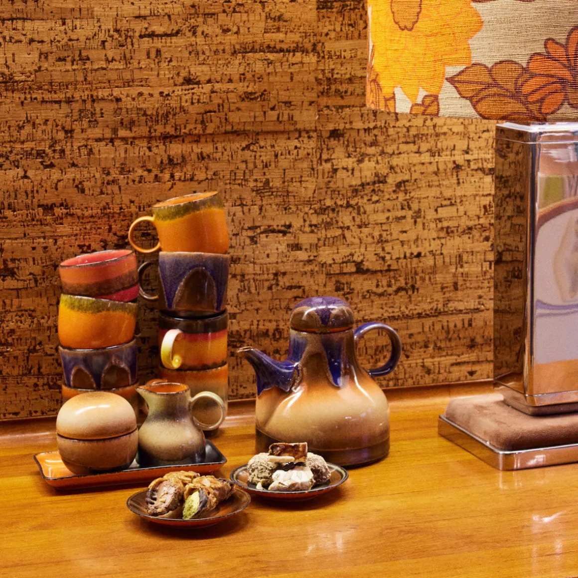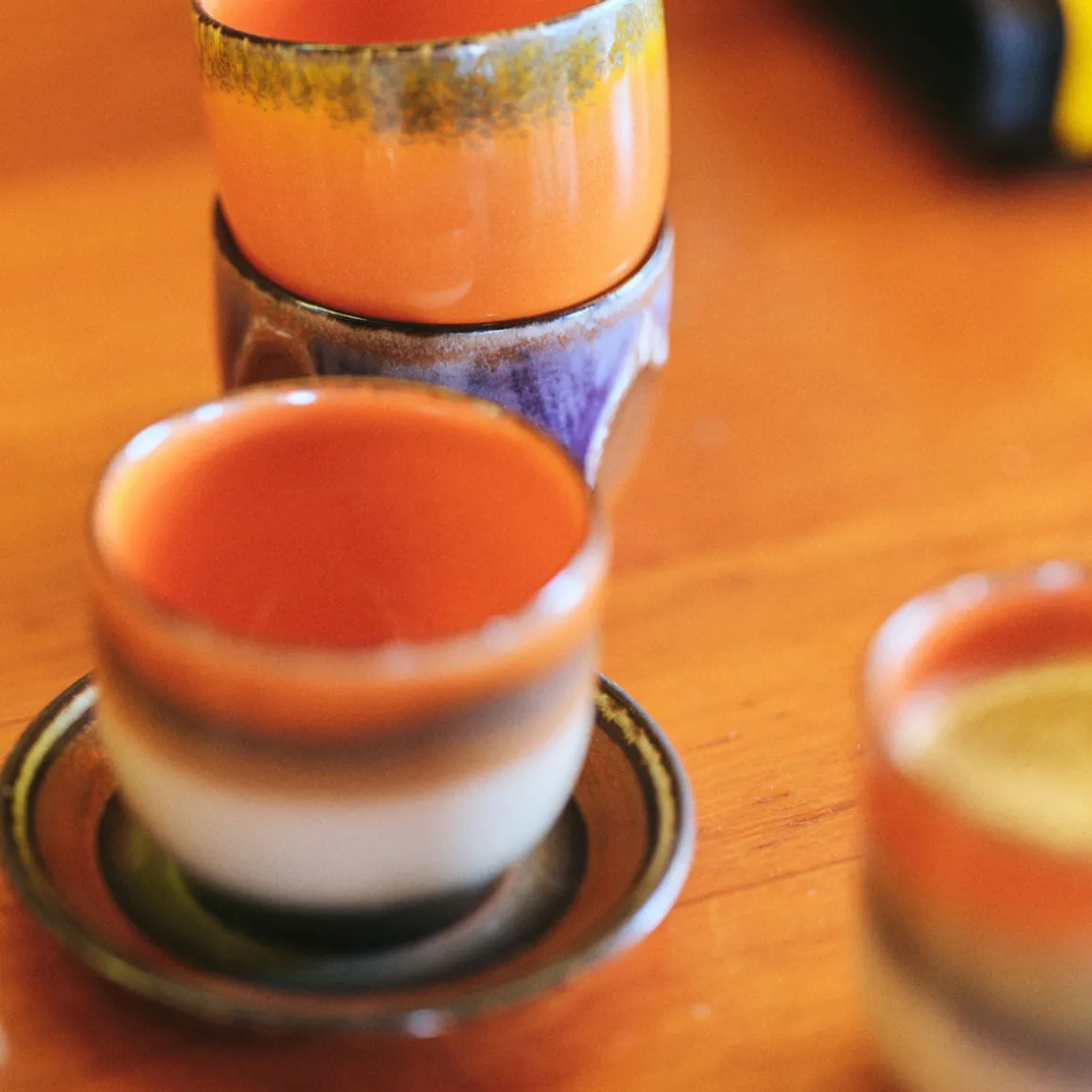 La palette riche et chaleureuse et les motifs groovy créent un festin visuel qui vous invite à savourer votre café dans un véritable style vintage.